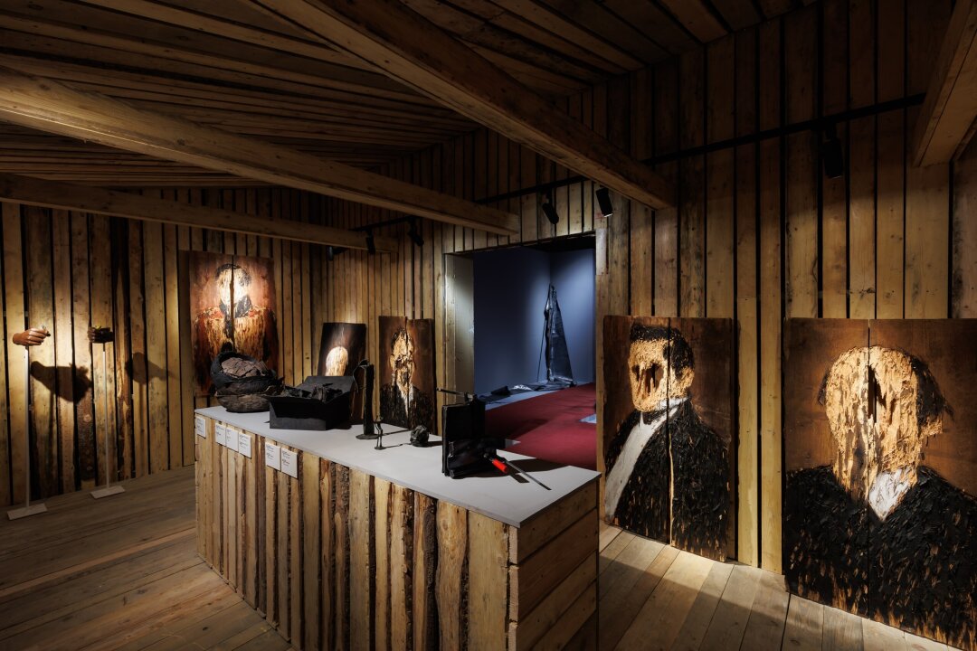 Дальше зрителю предлагается проделать путь то ли вместе с этой двуликой головой, то ли внутри ее мыслей. Маршрут принципиально не гибок. Экспозиция построена как линейное повествование. Десять предлагаемых остановок можно осуществить только в определенном порядке (с небольшой оговоркой в предпоследнем зале). Более того, во время экскурсии Александр Дашевский, уподобляясь Гэндальфу в «Путешествии туда и обратно», призывает посетителей не сходить с ковровых дорожек, которыми обозначен маршрут. Якобы чтобы не нанести на них грязь. Но кажется, чтобы зритель строго следовал по проложенной тропинке смыслов. Как Элли по дороге из желтого кирпича, мы устремляемся по красному ковролину не то к пресс-волу какой-то премии, не то в казенный кабинет, а попадаем на первую остановку, озаглавленную «Человек труда».