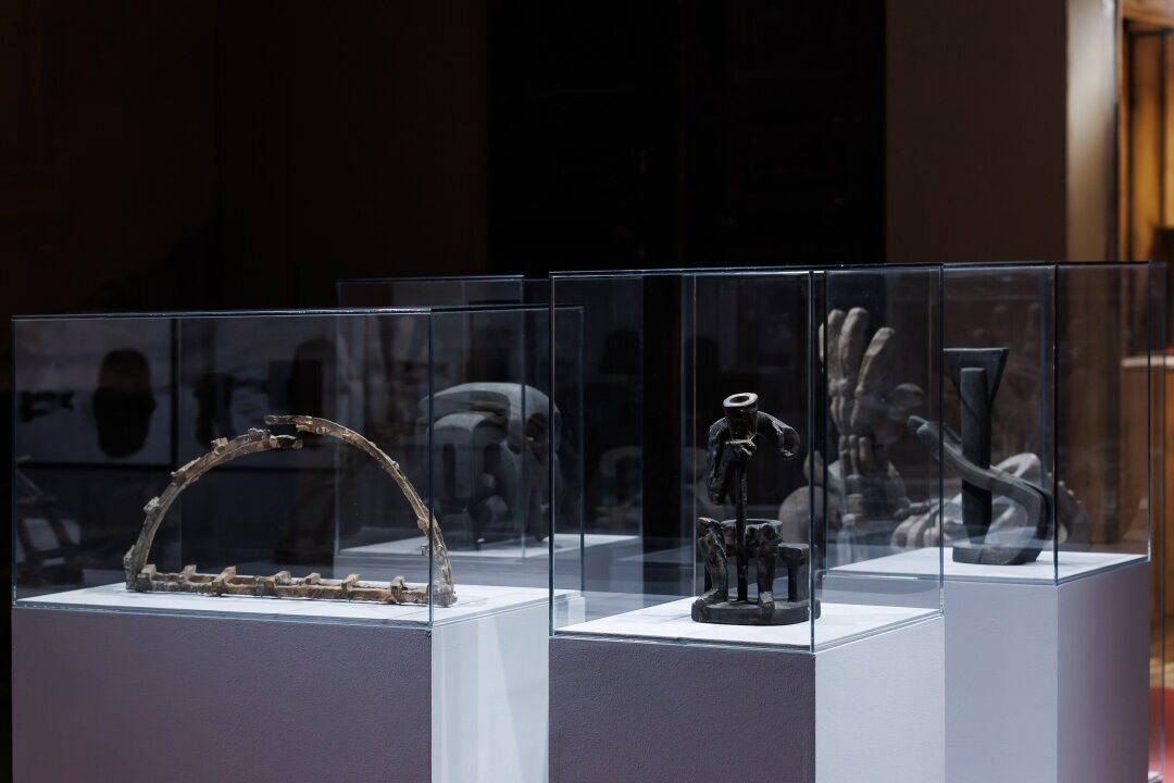 Открывается экспозиция двумя скульптурами. Собственно «Головой современника» Сидура, давшей название выставке, и безымянной головой Сергея Волкова. Они иллюстрируют два варианта восприятия окружающего — попытку понять и прожить происходящее или, наоборот, замереть внутри себя, отгородившись от мира.