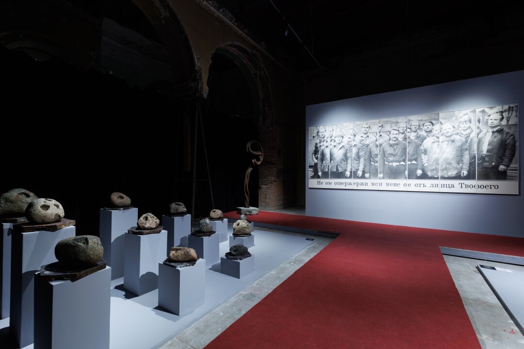 В первом зале зрителю предлагают обратить свои мысли к вопросам, связанным со сменой социалистического строя на капиталистический и ее общественным последствиям. Рябит, размываясь вместе с уходящей эпохой, протокольный портрет коллектива завода «Серп и молот», сделанный Владимиром Куприяновым в 1990-м и сопровожденный словами из покаянного 50-го псалма: «Не отвержи мене от лица Твоего». Разлагаются, превращаясь в черепа, головы рабочих на шестиугольных подставках из ржавых элементов индустриального пола в инсталляции Семена Мотолянца. Декадентски изгибается лишенная функциональной красоты рельса в объекте Владимира Логутова «Деиндустриализация».