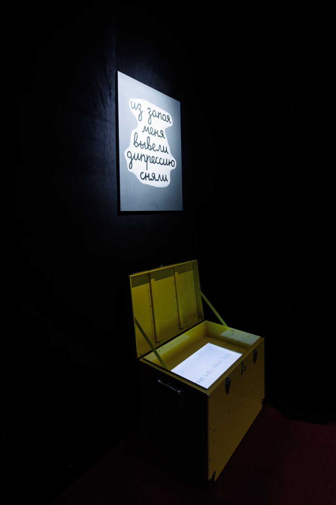 Завершается путешествие по тропинке из красного ковролина двумя произведениями. Надписью Анны Желудь на фанере «Из запоя меня вывели, дипрессию сняли» и желтым чемоданчиком Максима Татаринцева, со дна которого английскими словами утверждается: «И это тоже пройдет».