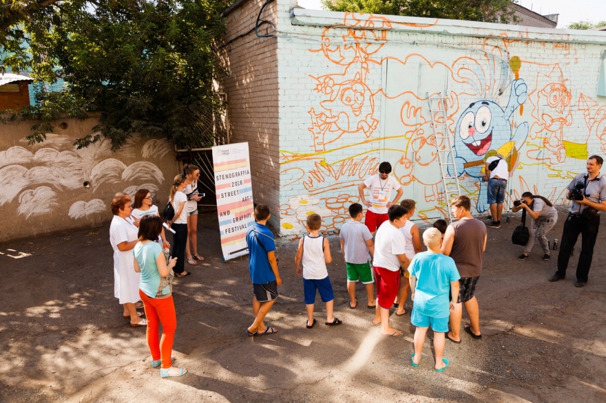 Детский хохот, ладошки в краске и бесконечные слова благодарности, вслух и на бумажных самолетиках — именно этим запомнились две акции «Стенограффии» под названием «Вид из окна». Вместе с юными пациентами больниц Оренбурга и Омска ведущие граффити-художники, участвовавшие в фестивале, нарисовали огромные красочные композиции во дворах медицинских учреждений. Теперь ребята, находящиеся на лечении, могут каждый день видеть из окон своих палат не грустные серые стены, а ярких героев любимых мультфильмов и сказочных персонажей.