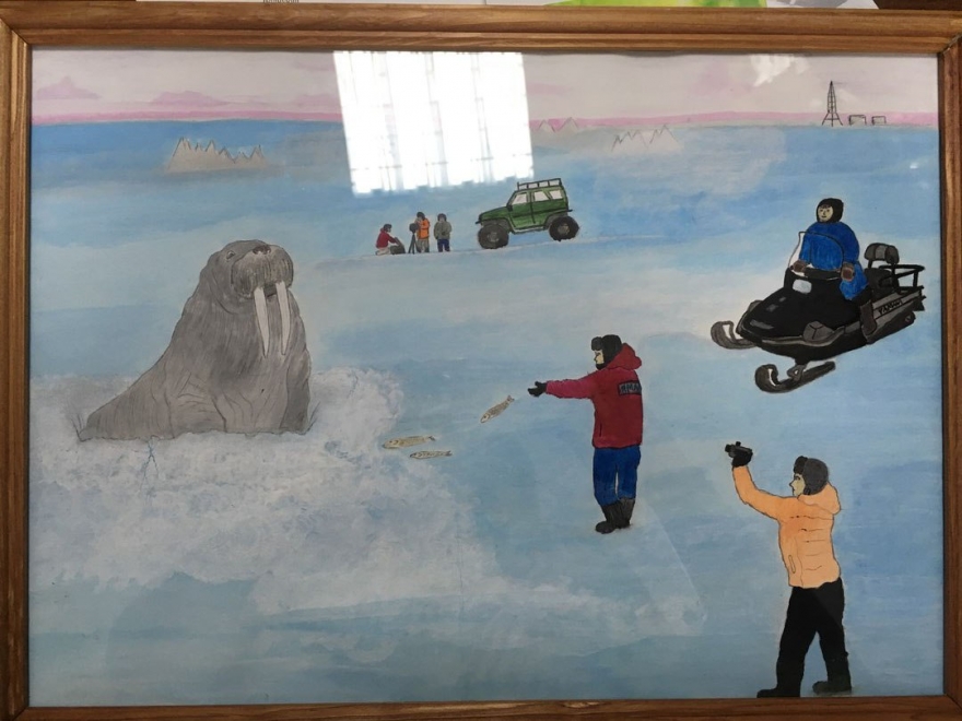 Саша Хохлова, команда «Крепкий палец»: «Север — суровый и прекрасный край, населенный самыми разными людьми. Судьба подарила нам возможность побывать там, познакомиться с талантливыми детьми и на основе их рисунков сделать свой. И мы сделали моржа. Могучего здоровяка, «ходящего на зубах». Хотелось добавить красок в место, где полгода почти не видно солнца, и, судя по улыбкам местных жителей, нам это удалось. А еще в последний вечер рисования из тундры медленно приполз туман, как раз в тот момент, когда мы доводили завершающие штрихи. Как будто ямальские шаманы пришли поздороваться с моржом, признав в нем брата. Пусть этот рисунок и дальше дарит улыбки жителям Заполярья».