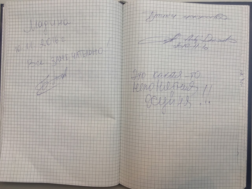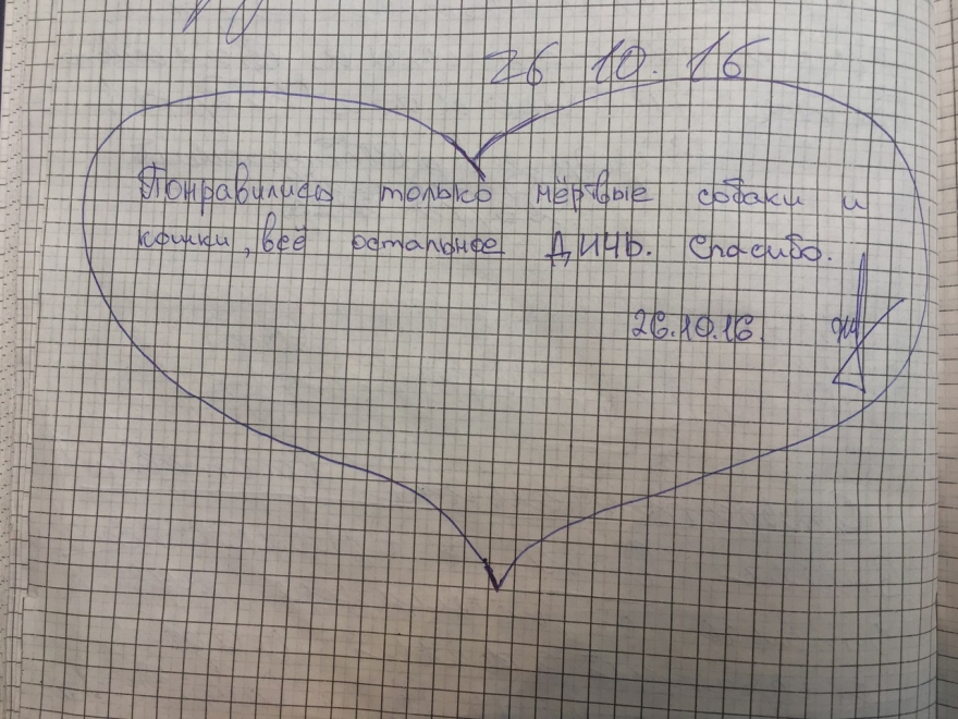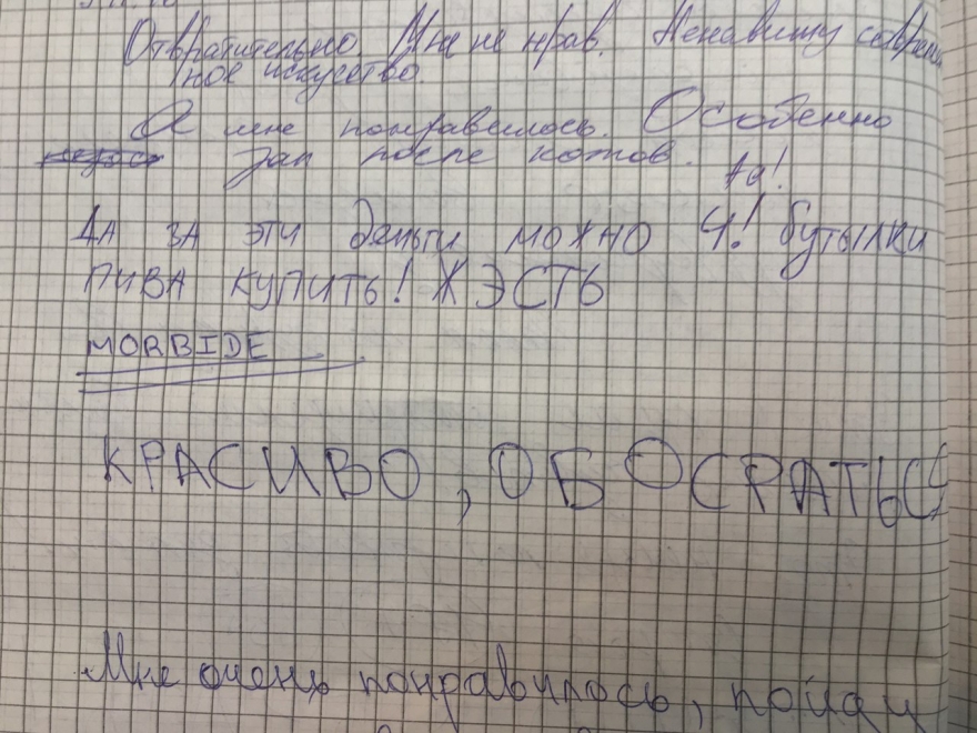 Выставка «Ян Фабр: Рыцарь отчаяния — воин красоты» с экспонатами в виде чучел животных разделила Петербург на два лагеря: гневные отзывы противников (среди которых Елена Ваенга и Виталий Милонов) скрепляет хэштег #позорэрмитажу, а защитники искусства в любых формах под предводительством Сергея Шнурова пишут #позорпозору. Мы сфотографировали лучшие мнения в аналоговой «Книге отзывов» в Главном штабе — в залах которого среди мишуры и блестящего дождика на крюках висят домашние коты и собаки.