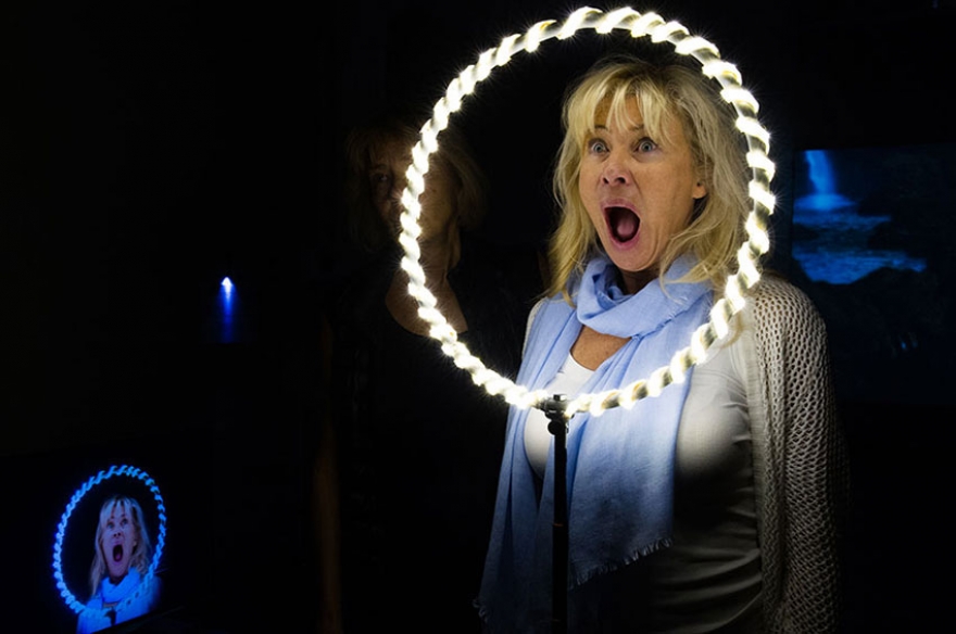Вертикальный светодиодный стержень высотой в два метра считывает перемещения и движения людей вокруг него и воспроизводит различную звуковую гамму и цветовую палитру.