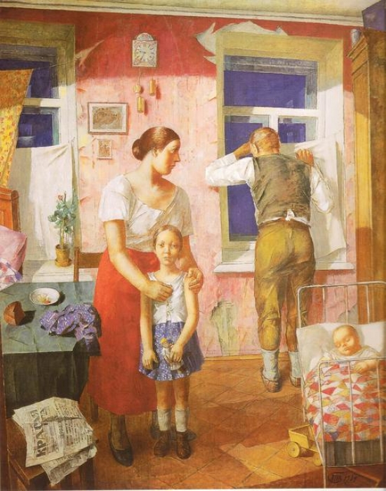 Даже в очевидно ангажированных, угодных большевистской диктатуре картинах он не допускает прямолинейности или пропагандистской плакатности. В картине «1919 год. Тревога» в центре сюжета — семья молодого рабочего, застывшая в тревожном страхе перед надвигающимися на город белогвардейцами. Но яркое цветовое решение, отступление перед прямой перспективой «остраняют» эту картину, превращая тревогу в чувство почти экзистенциальное, а не сиюминутное.