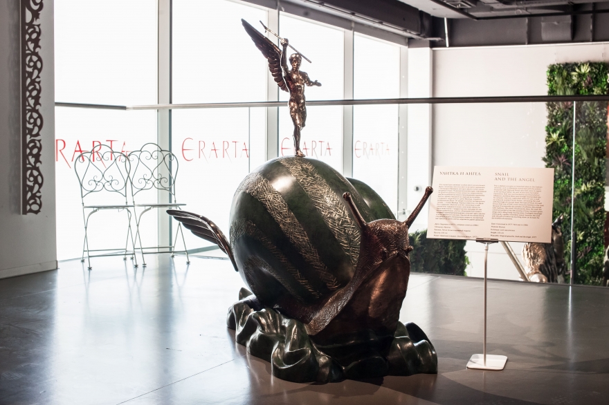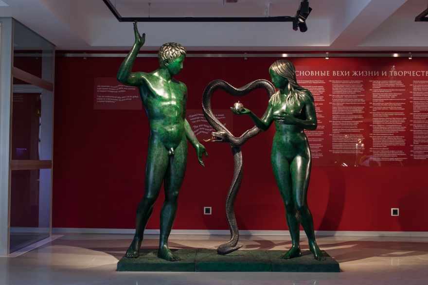 Одна из наиболее ранних (среди представленных) работ. На бумаге оригинал гуашью был сделан в 1968-м, а отлили скульптуру в 1984 году. Дали изображает самый драматичный момент в Эдеме: Ева предлагает Адаму вкусить запретный плод. Он, еще не зная, чем для человечества обернется его грехопадение, в изумлении и нерешительности поднимает руку. Знающий о грядущем изгнании из рая змей пытается утешить обреченных (и в скором времени смертных) людей и сворачивается в форму сердца, напоминая Адаму и Еве о том, что у них все еще есть любовь. И она нечто целое, которое всегда больше суммы отдельных частей.