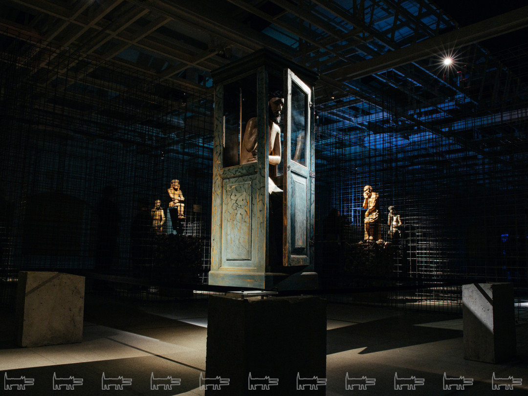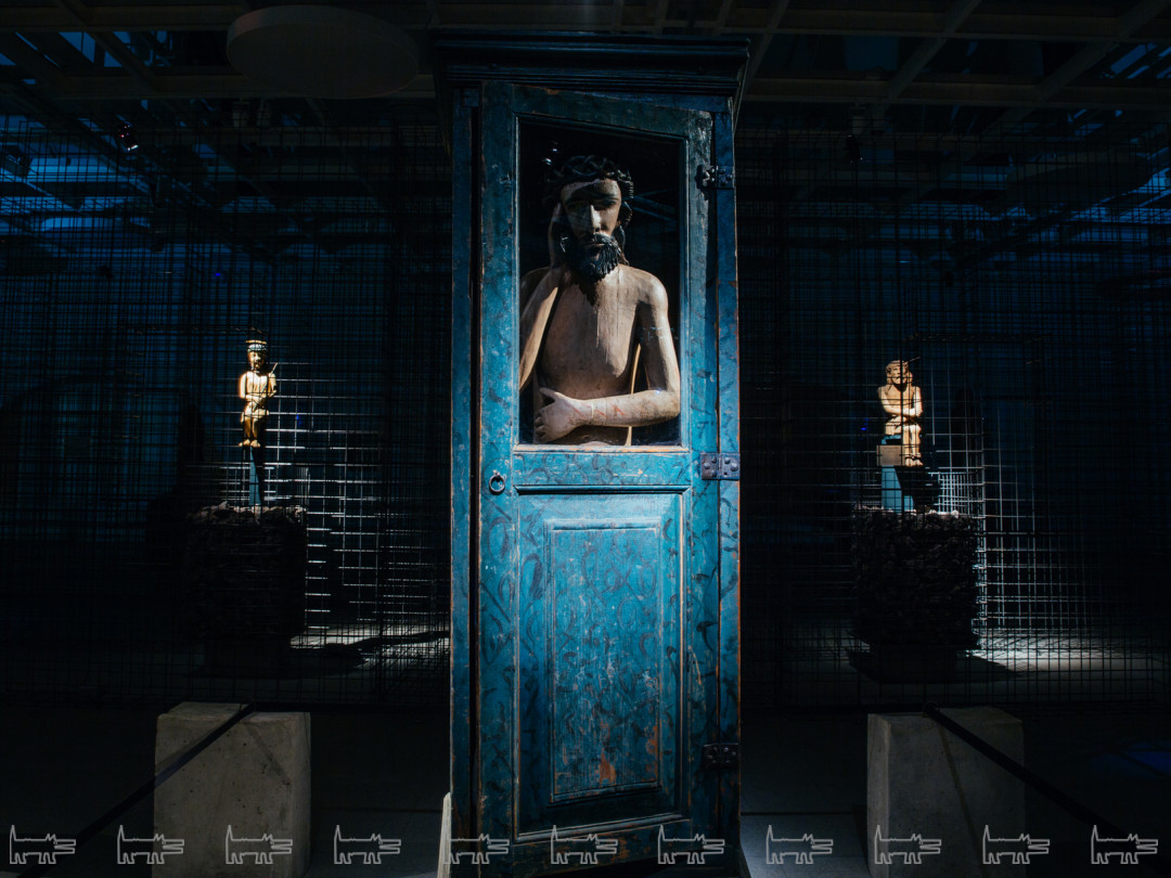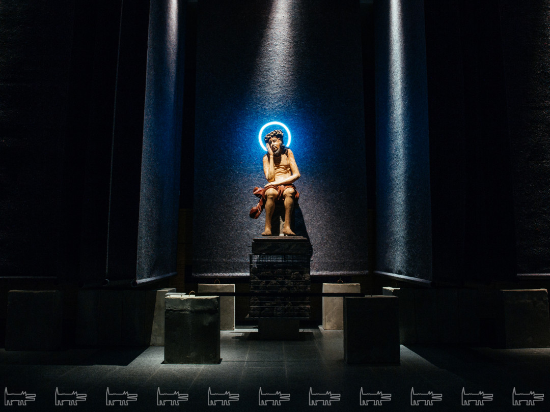 33 деревянных изваяния Христа 17–19 веков из дюжины российских музеев, инсталляция из решеток и неоновых нимбов, смотрители в черных свитшотах с терновыми венками: как устроен кураторский проект ректора Академии Художеств Семена Михайловского «Христос в темнице», который с 16 января открыли в «Манеже».