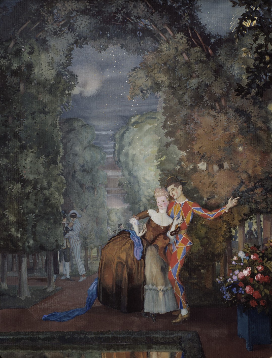 Ожидание персональной выставки Константина Сомова в Русском музее в этом году скрашиваем поездкой в Третьяковскую галерею, где хранится самая большая коллекция графики художника. Вместо ретроспективы к 150-летию — тройная экспозиция, где к Сомову добавили еще двух мирискусников — Сапунова и Судейкина, назвав всех троих «арлекинами». Этот персонаж итальянского народного театра, Commedia dell'arte, по мнению кураторов, стал не только героем работ, но и своеобразным альтер-эго всех трех художников. Все трое придумывали декорации и эскизы к спектаклям, занимались «дизайном» книг и афиш, хотя слова «дизайн» тогда еще не существовало, искали формы, сюжеты и стилистические приемы в прошлых эпохах.