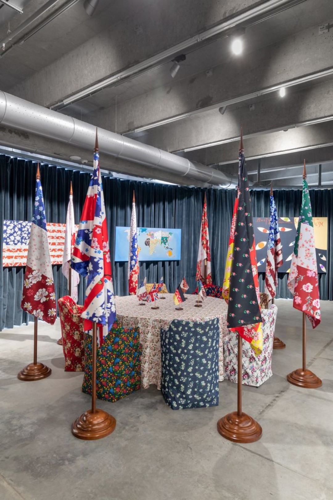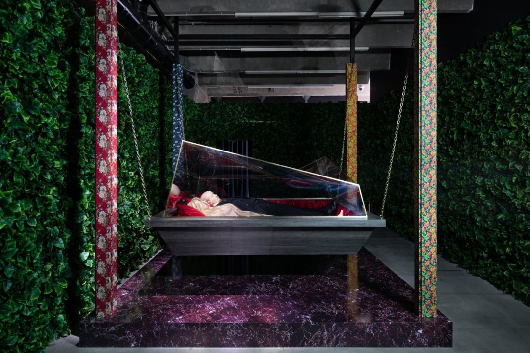 Павел Пепперштейн — главный мистификатор российской арт-сцены, который, кстати, придумал термин «совриск» для того, чтобы над ним издеваться. Слово вошло в обиход и используется неосведомленной публикой без всякой ироничной коннотации. Павел родился в семье московского концептуалиста Виктора Пивоварова и перенял у старшего поколения умение делать тотальные инсталляции и тонкую абсурдную графику. Сам он работает уже не с образами советской действительностью, а с массовой культурой и собственноручно созданными мифами. Выставка в «Гараже» — это альманах мифотворчества художника, и если большинство работ сложно расшифровать без чтения книг Пепперштейна (или хотя бы знакомства с его внушительным oeuvre), то две центральные инсталляции впечатляют сами по себе. В затемненном фантазийном мавзолее Павел кладет Ленина в хрустальный гроб рядом с красавицей-блондинкой, а зал заседания мировых лидеров оформляет флагами с пестрыми цветочными паттернами, как на типичных советских тканях для платьиц и халатов.