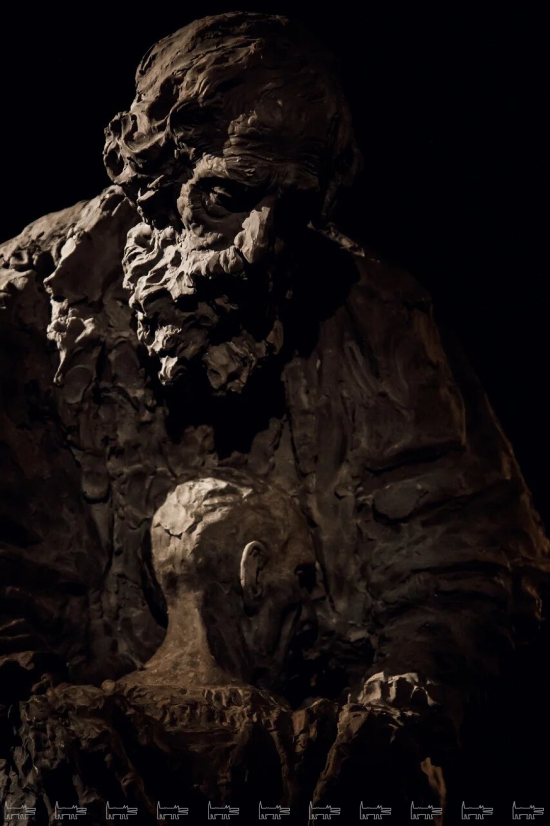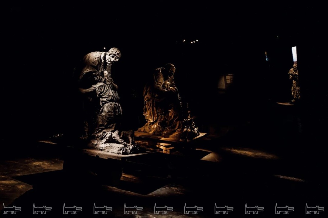 Первая задача: чтобы выставка смотрелась цельно, чтобы у нее было начало, основная часть и завершение. На втором этаже Александр Николаевич Сокуров озадачен вопросами, проблемами. Его постоянно что-то беспокоит, теребит: он ищет новые формы реализации. Ему недостаточно только кино, видео, ему надо, чтобы и скульптура была, и живопись была, и звук. И чтобы все это вместе воздействовало на зрителя. Он ищет новые формы самореализации. Человек, который попадает на второй этаж, в его инсталляцию, оказывается в каком-то ужасно напряженном пространстве. Зеркала все время движутся, фигуры отражаются, мозг едет. Вдруг рядом с «Блудным сыном» Рембрандта появляется «Христос в пустыне» Крамского — все это неожиданным образом оказывается связано.