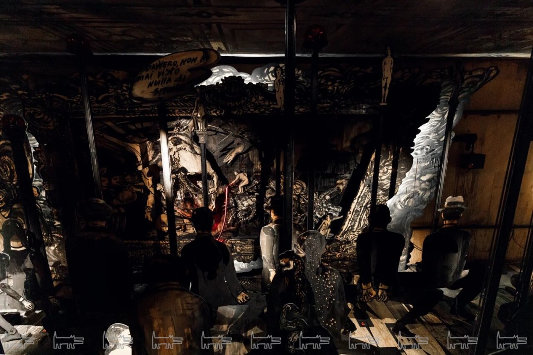 Я был в Сеуле, мне позвонил Семен Михайловский и предложил делать русский павильон, аргументировал тем, что это будет интересным приключением — будет что рассказать детям. Заказа как такового не было, кроме того что тема — Эрмитаж, на этом весь заказ заканчивался. Это не персональная выставка, конечно, я работаю в некоем коридоре взаимодействия с большой институцией, для меня это привычно, так как я давно сотрудничаю с БДТ. Из опыта создания сценографии для спектаклей и взялись мои фанерные фигурки. Когда делаешь эскизы или макет, то вставляешь персонажей, они замершие как правило — они задают масштаб, становятся своеобразными модулями. Сначала я рисовал неких персонажей, которые уже потом мизансценировались на уровне рисунка, как в раскадровке для кино. Для этого нужно создать определенную архитектуру или декорации. С этой привычкой я пошел дальше в современное искусство. Какие эмоции вызывает инсталляция Сокурова? Когда я понял, что я буду работать в одном проекте с Сокуровым, я испытал художественный оргазм, потому что к нему, как к фигуре я отношусь очень серьезно и много смотрел с 90-х годов. Поэтому уже из уважения к Александру Николаевичу, я принимаю все, что он делает, хотя понимаю, что всякие инсталляции — это не совсем его территория.