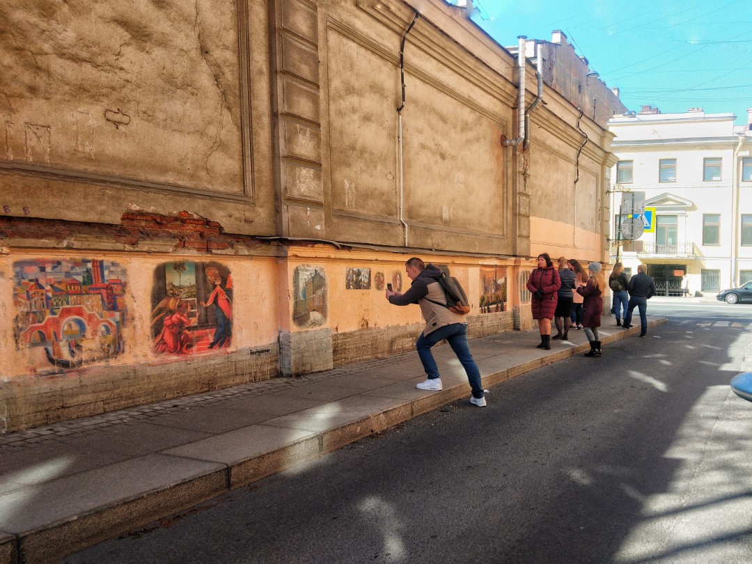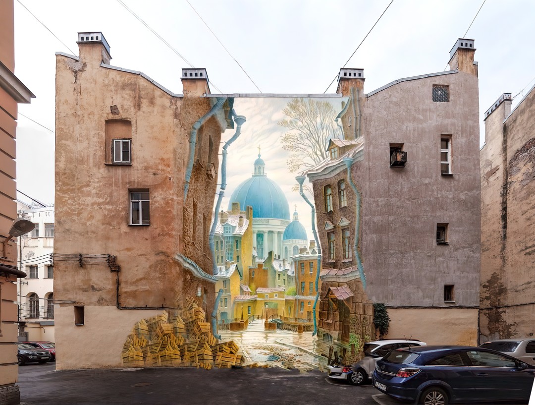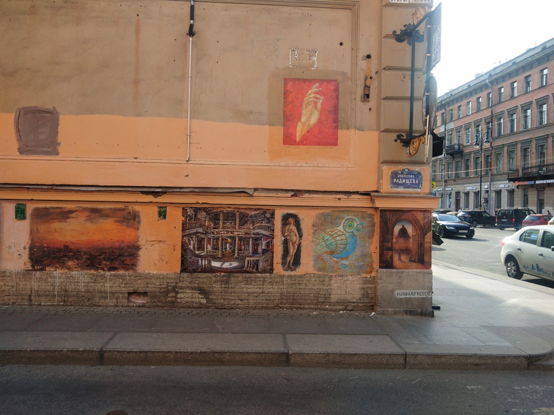 По сути технология urban-фрески или «цифровой фрески», которую продвигает Олег Лукьянов, руководитель собственного Центра печати — это переводная картинка. Красочный слой переносится прямо на бетонную стену, кирпичную кладку или любой сложный рельеф без предварительной подготовки. Это техническое решение позволяет экономить на услугах художника-оформителя или монументалиста. Офис Олега находится недалеко от стены на переулке Радищева, где бизнесмен в феврале поместил первую фреску — репродукцию картины Боттичелли. Также Олег публиковал в соцсетях проекты масштабных муралов, которые можно реализовать благодаря его услугам: на фотографии петербургских брандмауэров он накладывал работы популярных художников вроде Андрея Белле или виды городских достопримечательностей. Выглядят эти сделанные в фотошопе картинки немного пугающе: будто кто-то распечатал и наклеил на стену дома огромные «фотообои» из типичного интерьера 90-х. Олег успокаивает тех, чье чувство прекрасного задели его намерения: «Это всего лишь примеры того, как можно реализовать нашу технологию, мы не будем реализовывать то, что вы видите, мы как раз ищем таких художников, которые будут уместны в городском ландшафте, которые будут смотреться неоднозначно и будут цеплять». В пример приводит Владимира Колбасова, автора, известного по серии акварелей «Город», который 10 лет работал в должности главного художника Василеостровского района.