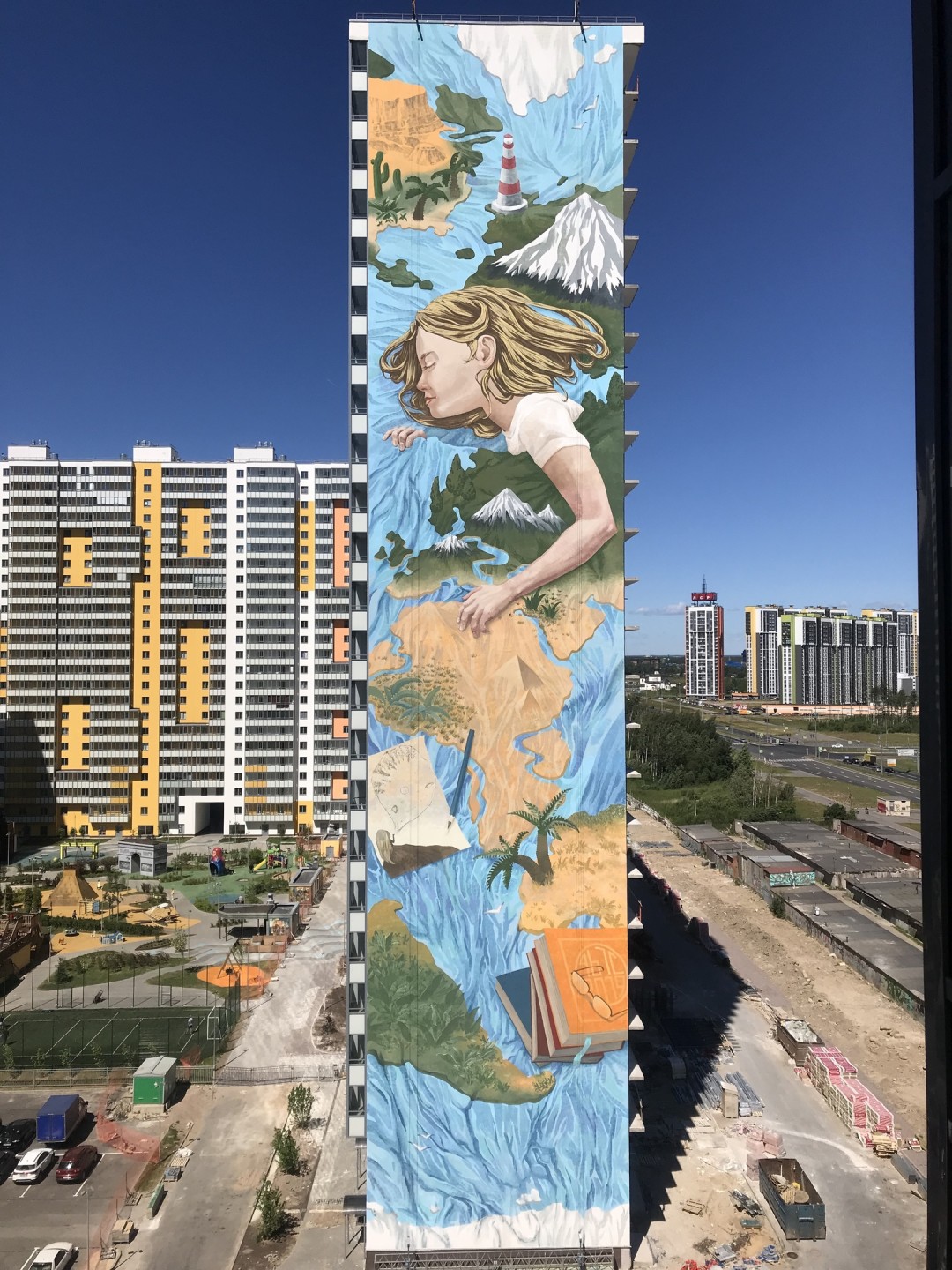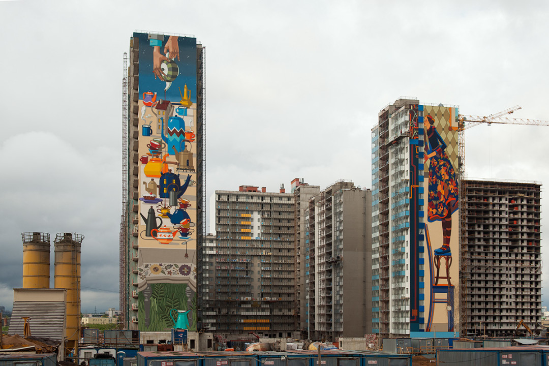 «Зал славы» граффитчиков застройщики сохранили, а однообразный пейзаж новых 24-этажных кварталов разбавили огромными росписями ребят из разных городов страны. Каждый из них прошел путь от райтера до профессионального художника-муралиста со своим стилем. Один из брандмауэров ЖК отдали под абстрактную геометрию от современных последователей супрематизма Aesthetic group (Petro из города Жуковский и Slak из города Белоозерский). Еще два брандмауэра превратились в диптих по мотивам «Алисы в Зазеркалье» —коллаборацию художников Алексея Канунникова aka Kislow из Севастополя и Романа Мураткина из Подмосковья. Вместе два фасада составляют сюжет из истории девочки, заглянувшей за стену своей квартиры и оказавшейся в необычном и увлекательном фантазийном мире, где, например, обычный жилой квартал выглядит как стол, накрытый для чаепития. Самые свежие муралы от иркутского художника Васи LST и Рустама QBic появились неделю назад и посвящены теме путешественников и первооткрывателей.