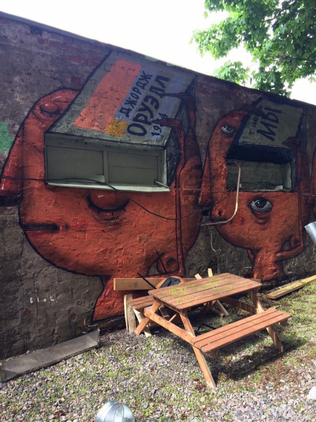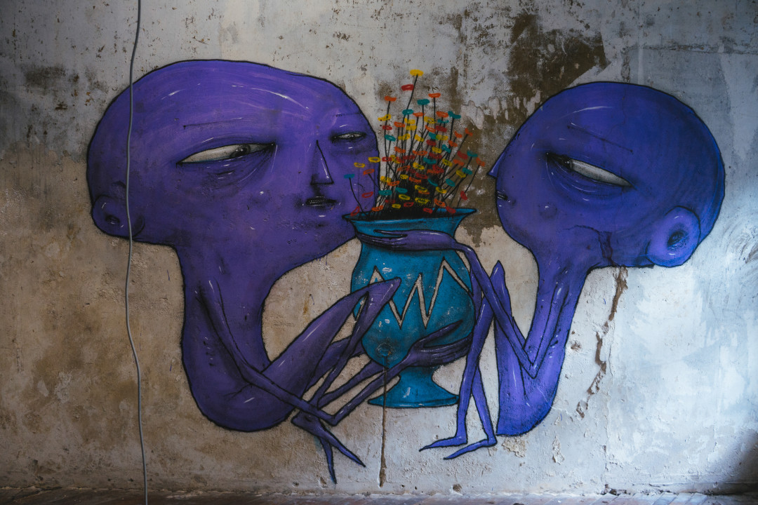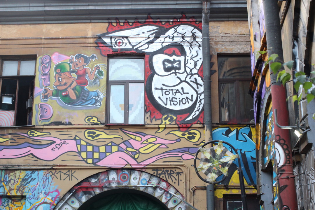 В мае к фестивалю «День Финляндии» иллюстраторы София Коловская и Тео Георгиев создали мурал «Spirit of Finland», который воспевает связь финской природы и энергию динамичного современного города. Во дворе бара «Мачты» найдете две работы художника Саши Блота, который полгода назад переехал в Петербург из Пензы. Первая — «Слышать самого себя» — была создана к Международному дню охраны здоровья уха и слуха. «Это размышление о том, что каждый из нас может прислушиваться к себе и делиться информацией с миром. Персонаж, образующий с ракушкой единое целое, символизирует внутреннее звучание наших мыслей, которые мы транслируем, высвобождаем, пропуская через себя», — комментирует художник. Вторая работа отсылает к известным антиутопиям «1984» Джорджа Оруэлла и «Мы» Евгения Замятина.