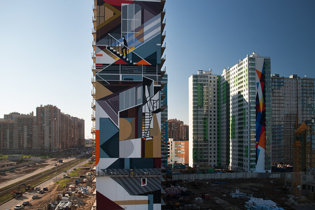 «Зал славы» граффитчиков застройщики сохранили, а однообразный пейзаж новых 24-этажных кварталов разбавили огромными росписями ребят из разных городов страны. Каждый из них прошел путь от райтера до профессионального художника-муралиста со своим стилем. Один из брандмауэров ЖК отдали под абстрактную геометрию от современных последователей супрематизма Aesthetic group (Petro из города Жуковский и Slak из города Белоозерский). Еще два брандмауэра превратились в диптих по мотивам «Алисы в Зазеркалье» —коллаборацию художников Алексея Канунникова aka Kislow из Севастополя и Романа Мураткина из Подмосковья. Вместе два фасада составляют сюжет из истории девочки, заглянувшей за стену своей квартиры и оказавшейся в необычном и увлекательном фантазийном мире, где, например, обычный жилой квартал выглядит как стол, накрытый для чаепития. Самые свежие муралы от иркутского художника Васи LST и Рустама QBic появились неделю назад  и посвящены  теме путешественников и первооткрывателей.