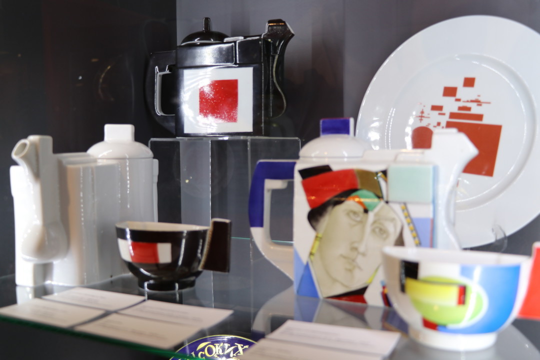 После национализации изменилось не только имя завода, но и задачи — «сохранив лучшие традиции русского художественного фарфора, выработать агитационный фарфор в высоком смысле этого слова». Художественным руководителем ЛФЗ назначили Сергея Чехонина — «мастера советского ампира». Художник создал собственную школу росписи по фарфору, а на агитационных тарелках появились его шрифты. Шрифтовые работы мастера вы можете увидеть во многих знаменитых книгах тех лет, например, на обложке издания Джона Рида «10 дней, которые потрясли мир» 20-х годов. Визитная карточка Сергея Чехонина — орнамент «Роза и маска», реплика которого представлена на выставке. Под руководством Чехонина в разработке агитационного фарфора принимали участие ведущие художники того времени. В разное время на заводе работали Борис Кустодиев, Кузьма Петров-Водкин и Казимир Малевич. Последний изобрел знаменитую авангардную форму «Чайник Малевича». Современная художница ИФЗ Инна Олевская взяла за основу эту форму и изобразила на ней знаменитые черный и красный квадраты Малевича.