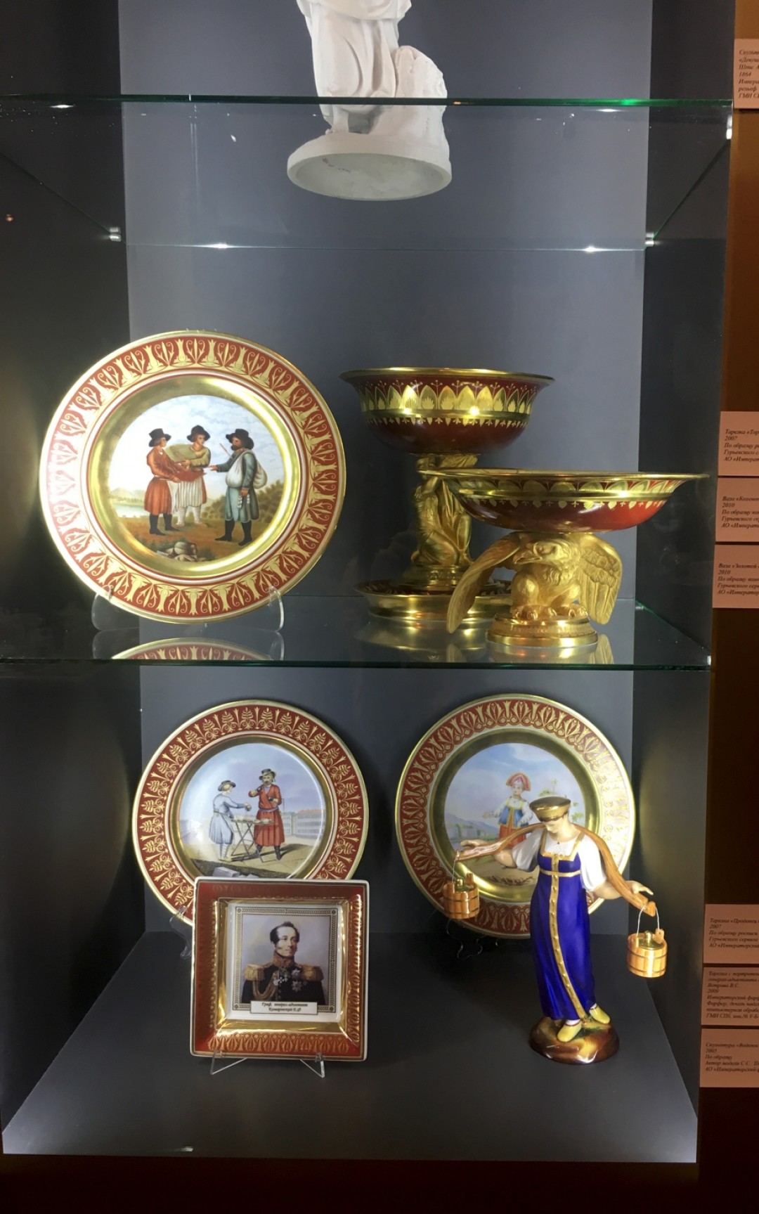 От вкуса и предпочтений российских императоров зависело то, как именно будет выглядеть фарфор, в какой стилистике мастера будут его расписывать. Эпоха Александра I — это время невероятной популярности стиля ампир. Работа над важнейшим фарфоровым шедевром той эпохи, «Гурьевским» сервизом, началась еще в 1809 году под руководством скульптора и модельмейстера Степана Пименова. Производство заняло 16 лет, в это время страна пережила Отечественную войну 1812 года. После победы над наполеоновской армией в искусстве господствовала народная тематика, а художники обращались к русским типам вместо античных героев. В «Гурьевском» сервизе ампирные формы и декор самих предметов поразительным образом сочетаются с изображением крестьянок, солдат и партизанов. «Гурьевским» сервиз назвали по имени графа Дмитрия Гурьева, в ведении которого находился в тот период Императорский фарфоровый завод. Этот масштабный проект окончили к началу правления Николая I, которое в истории русского фарфора ознаменовалось нахождением особого способа золочения фарфора. Поэтому сохранившиеся изделия николаевского периода отличаются качеством, мягкой полировкой, блеском и прочностью позолоты.