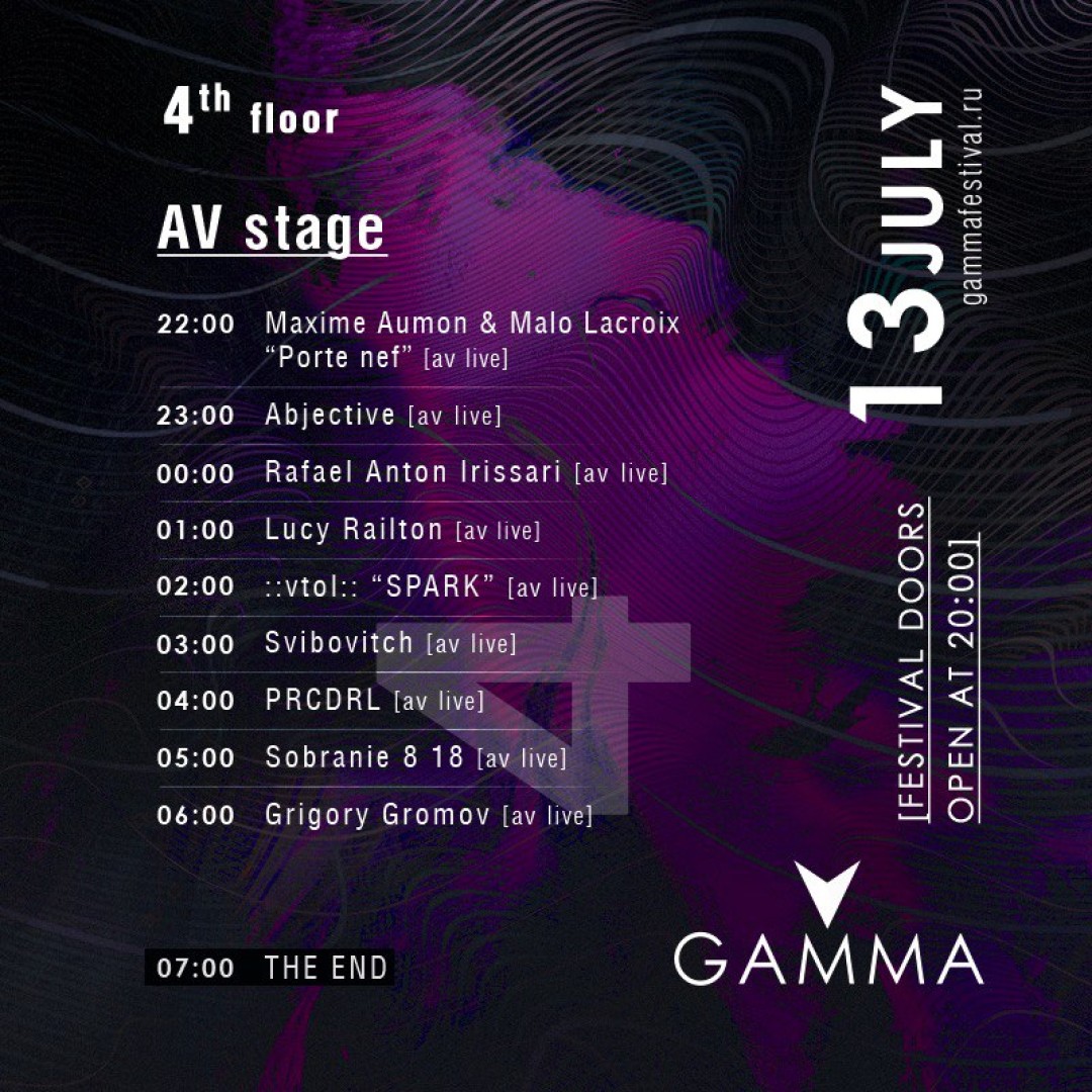 AI-сцена — результат работы участников лаборатории искусственного интеллекта и музыки Gamma_LAB AI. На аудио-визуальной сцене (AV) все выступления будут дополнены либо собственным вижуалом артистов, либо музыканты выступят в коллаборации с известными медиа-художниками. Российский медиа художник Дима Морозов, который работает под псевдонимом ::vtol::, представит перформанс Spark. Французский коллектив — Мало Лакруа и Максим Омон — привозят проект „Porte nef“, визуально-поэтический перформанс с аудиорядом IN AETERNAM VALE (Minimal Wave). Выступят участники шоукейса SHAPE, который привезут в Россию при поддержке программы Creative Europe, — Люси Рейлтон работает с акустическими инструментами и визуализацией, а Роберт Кургенвен подготовил световой перформанс AGENESIS для экспериментальной сцены.