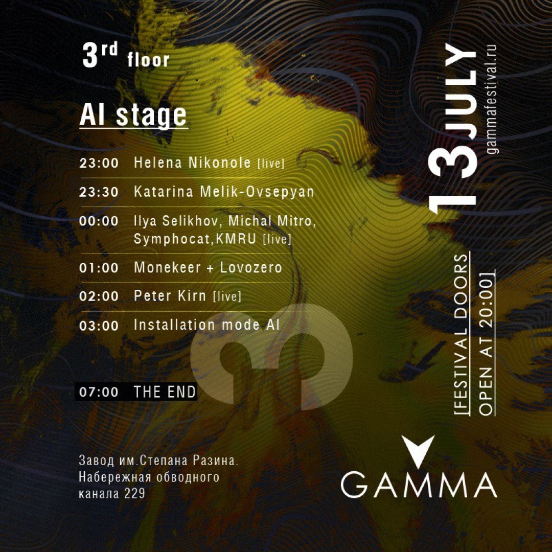 В этом году форум Gamma_Pro в «Планетарии №1» растянется на два дня — 11 и 12 июля. Во время основной программы на заводе Степана им. Разина 13 июля мультимедиа-искусству отдадут две сцены — AV (аудио-визуальную) и AI (искусственный интеллект), а site-специфик выставка займет несколько этажей.