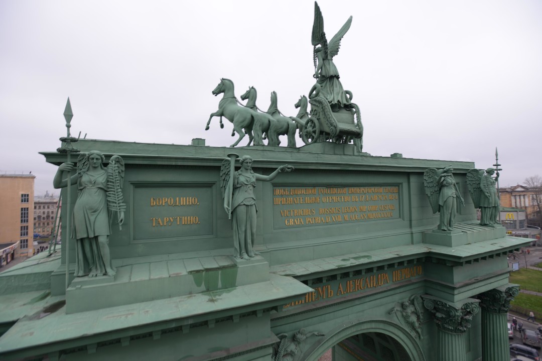 Вы когда-нибудь были внутри памятника? Оказывается за аттиком Нарвских триумфальных ворот скрывается выставочный зал Музея городской скульптуры, возможно, самый странный выставочный зал в городе. Чтобы попасть в него, нужно подняться по винтовой лестнице, спрятанной в корпусе ворот. Экспозиция регулярно меняется, сейчас проходит выставка с витиеватым названием «Преданья славы и любви», посвященная фигуре Александра Сергеевича Пушкина. Причем тут Пушкин? Кураторы выстраивают связи между поэтом и судьбами героев войны 1812 года, в честь победы в которой и установлены триумфальные ворота. В 1814 году войска проходили в город через деревянную арку, построенную по проекту Джакомо Кваренги. Она быстро обветшала, каменная версия появилась только в 1834 году. Ее украшают скульптурные группы работы Василия Демут-Малиновского, Степана Пименова и Петра Клодта, ответственного за коней на Аничковом мосту. На посещение внутренностей Нарвских триумфальных ворот уйдет около 15–20 минут, затем отправляйтесь изучать окрестные памятники конструктивизма.