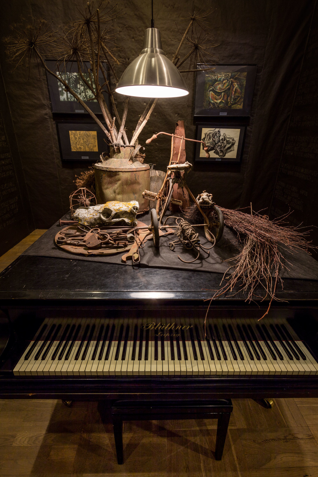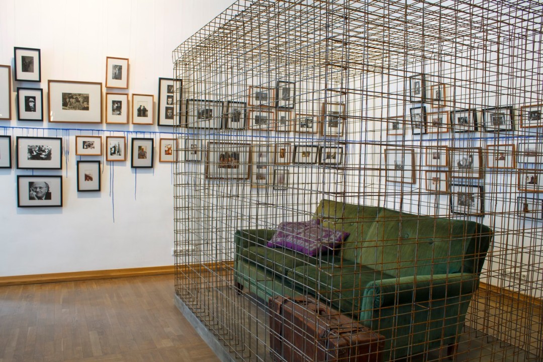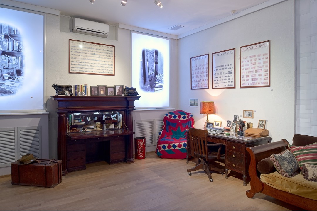 Художник Сергей Падалко «расчертил» выставочное пространство металлическими конструкциями с клетками-ячейками. В них «заключили» личные вещи поэта разных лет, вырванные из их бытового контекста, — изящное решение вечного музейного вопроса: как избежать набивших оскомину витрин?