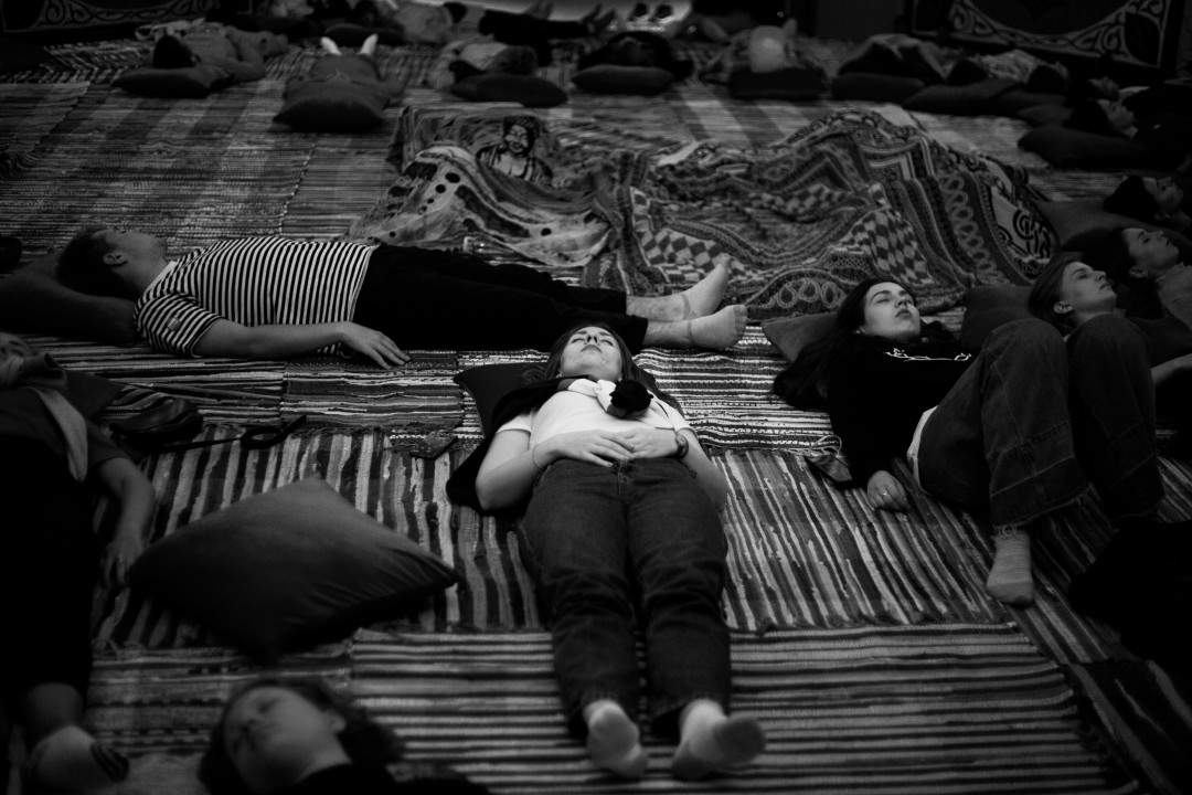 На самом деле выставка AES+F как будто специально придумана, чтобы в ней жить. Экспозиция устроена так, что в ней есть все необходимое типичному жителю большого города. Можно лежать на пуфике и несколько часов подряд смотреть на большом экране видео про красивое разложение — альтернатива вечернему «отвлекательному» просмотру сериалов. В «Пирах Тримлхиона» даже актеры сериальные: ветеран российского многосерийного телефильма Андрей Руденский (помнит ли кто-то «Остановку по требованию»?) и Никита Панфилов из «Сладкой жизни». Есть опция «посмотреть мемасики», правда аналоговые, из 1996 года — картинки на коврах «Исламского проекта», где Статуя Свободы «одета» в чадру, а музей Гуггенхайма «оснащен» минаретом. Когда 11 сентября 2001 года в результате теракта обрушились башни-близнецы, аеэсы благодаря этим работам приобрели статус арт-пророков. «Исламским проектом» в 90-е художники издевались над масс-медиа, которые мусолили тему исламской угрозы. В Манеже работы показывают в узорчатой палатке, устланной ковриками и мягкими подушками — в ней мы будем ночевать. Троллинг уровня AES+F: участники прошли конкурс 10 человек на место, купили билет (а многие специально приобрели спальники), чтобы провести ночь на полу в бедуинском шатре. Почти как в видео «Inverso mundus/ Перевернутый мир», где дворники садятся в кресла топ-менежеров, а свинья освежевывает мясника. Перед отходом ко сну и вечерним чаем — получасовая медитация под звуки поющих чаш и прочих восточных музыкальных инструментов. Главное — не ложиться слишком близко к «коврам». 6 лет назад они уходили с аукциона Vladey по 15 тысяч евро за штуку. В принципе, бюджетно. Само собой, художники в курсе массовой ночевки и наверняка смеются в кулачок.
