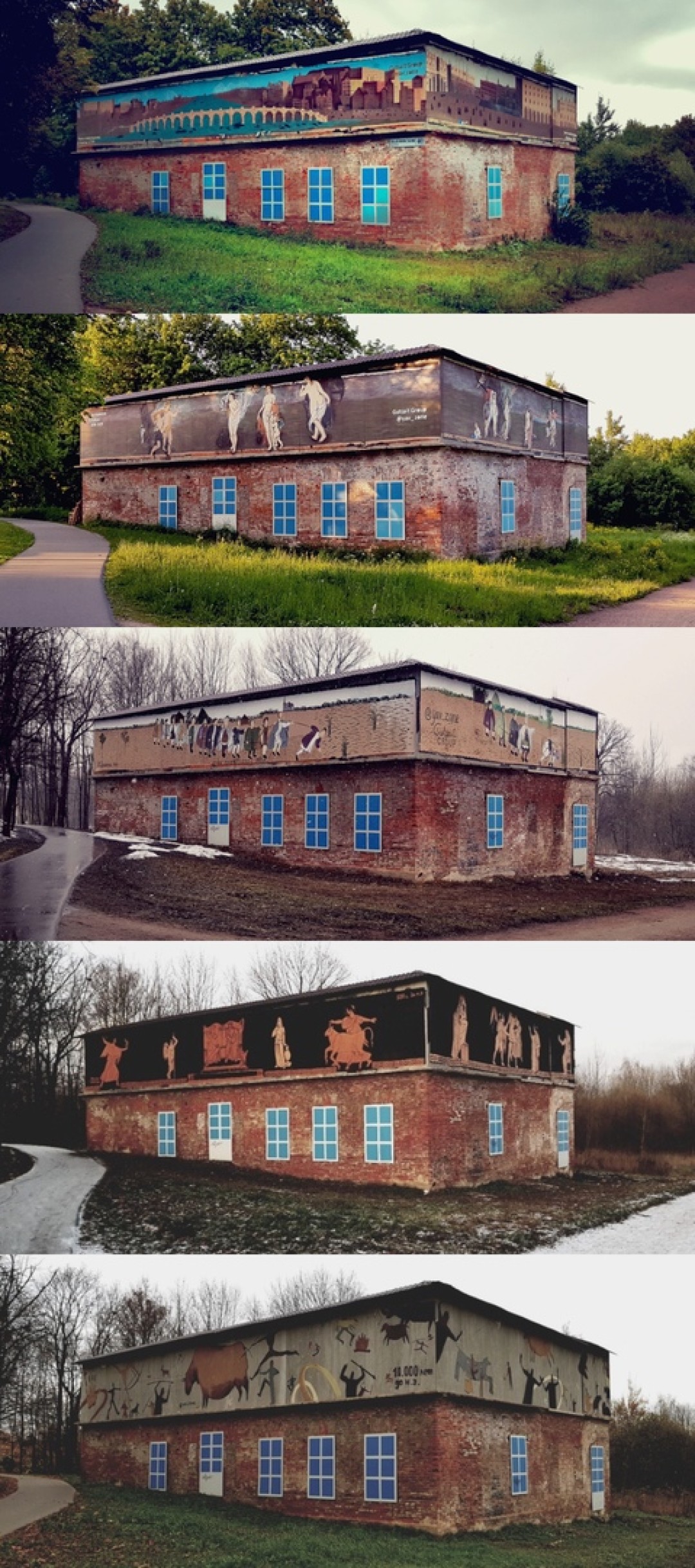 Напомним, 22 октября на фасаде заброшенного здания на Павловском шоссе, 40 появилось первое изображение — пещерные рисунки. Спустя некоторое время художники превратились в коммунальщиков и лично закрасили свою работу для того, чтобы поверх нее отразить следующий этап развития изобразительного искусства.