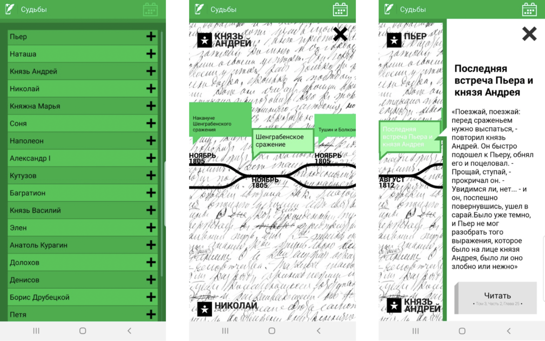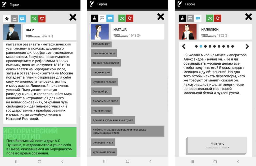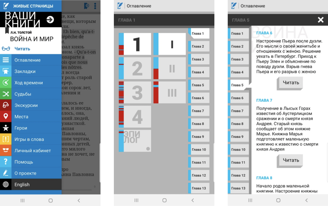 Приложение «Живые страницы», созданное компанией еще в 2015 году, в Год литературы в России, начиналось с «Войны и мира». Во время работы над первым текстом приложения было важно представить роман «Война и мир» с абсолютно новой точки зрения — показать то, что зачастую видно только литературоведам, но не обычным читателям. Кроме того, было важно изучить роман в контексте истории и культуры, выявить то, что сразу незаметно. Например, для сценария «Герои» были собраны эпитеты, которые Лев Толстой использовал чаще всего для персонажей романа. Это позволило создать портрет героя исключительно со слов автора, а также отследить изменение отношения Толстого к герою.