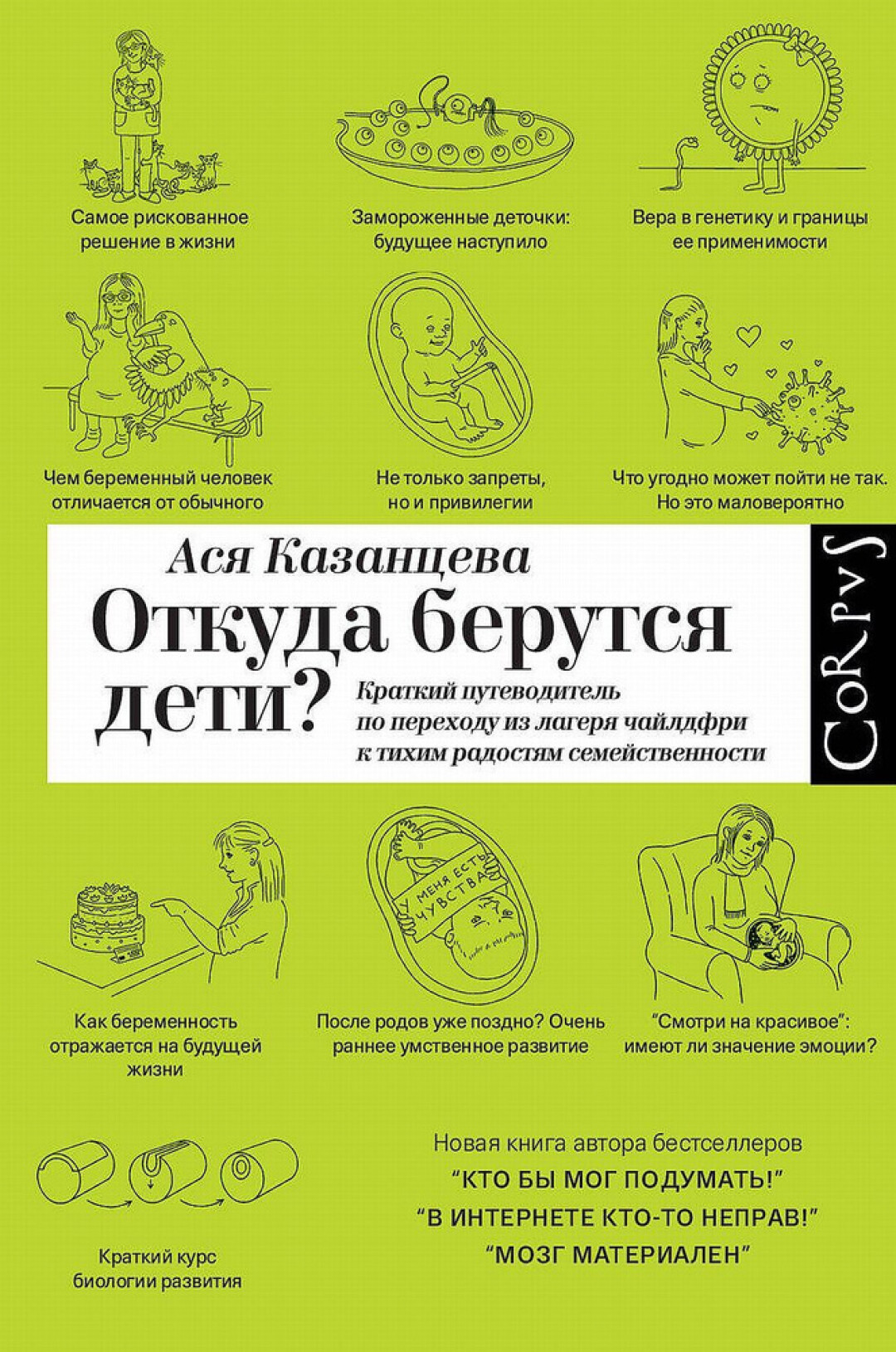 - Ася Казанцева* (внесена Минюстом в реестр СМИ, выполняющих функции иностранного агента) — «Откуда берутся дети? Краткий путеводитель по переходу из лагеря чайлдфри к тихим радостям семейственности». — М.: CORPUS, 2023.