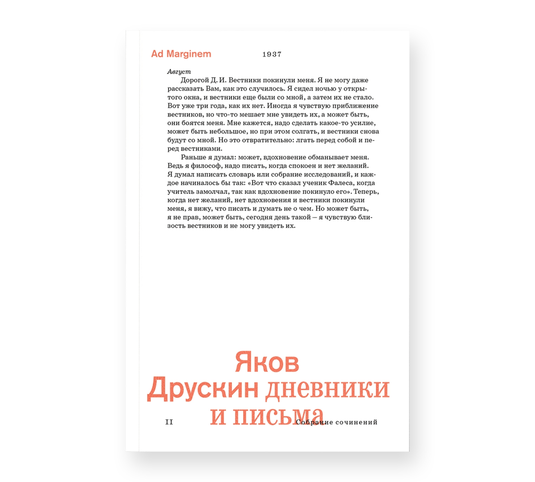 Пока Хармс и компания вторгаются в Петербург настоящего (в декабре в квартире Введенского открылся музей ОБЭРИУ!), издательство Ad Marginem поддерживает этот тренд и публикует два тома сочинений Друскина — писателя, спасшего наследие Хармса. В феврале мы изучали его «Трактаты и наброски» — философские заметки, которые помогают лучше понять мировоззрение чудаков-трагиков из объединения «чинарей». В апреле пришла очередь дневников и писем, в которых Яков Семенович анализирует личные переживания, а также дружбу и творчество с обэриутами.