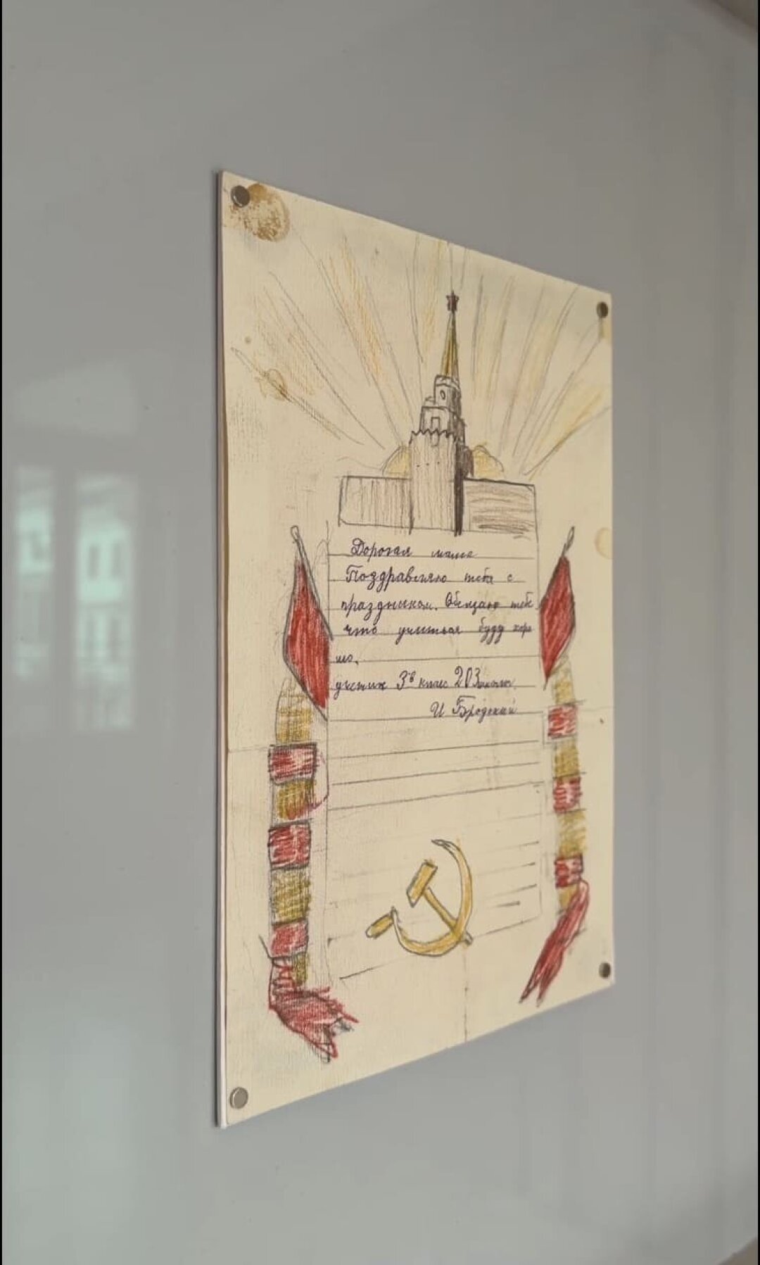 Музей «Полторы комнаты» открывает выставку одного рисунка Иосифа Бродского. В экспозицию войдет поздравление для мамы, Марии Моисеевны Вольперт, написанное будущим поэтом в третьем классе. Памятную работу можно будет увидеть до 21 мая.