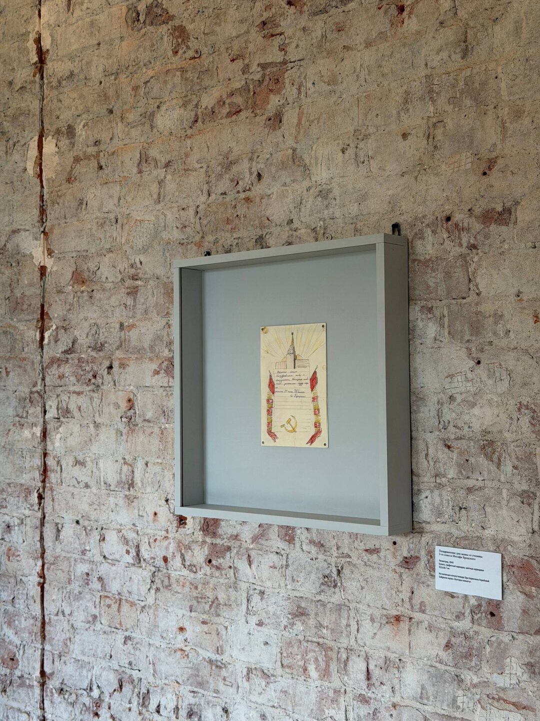 На рисунке, вошедшем в экспозицию, Иосиф изобразил Кремль, серп и молот, социалистические знамена. Автор добавил поздравительную подпись (орфография и пунктуация сохранены):