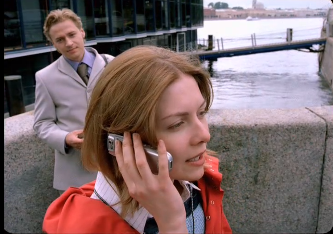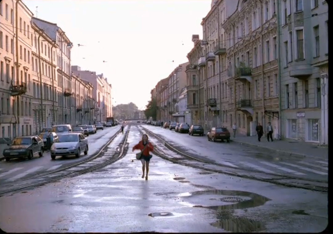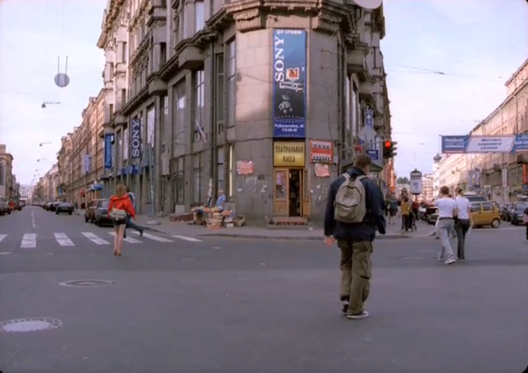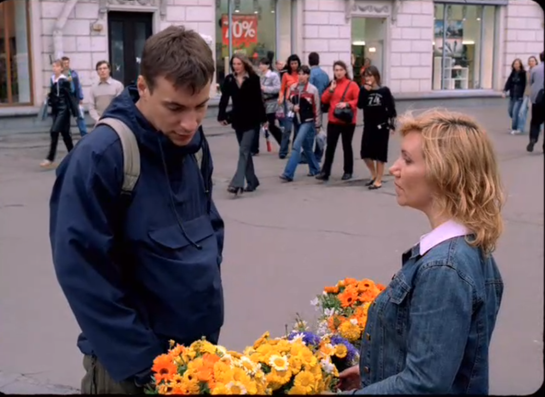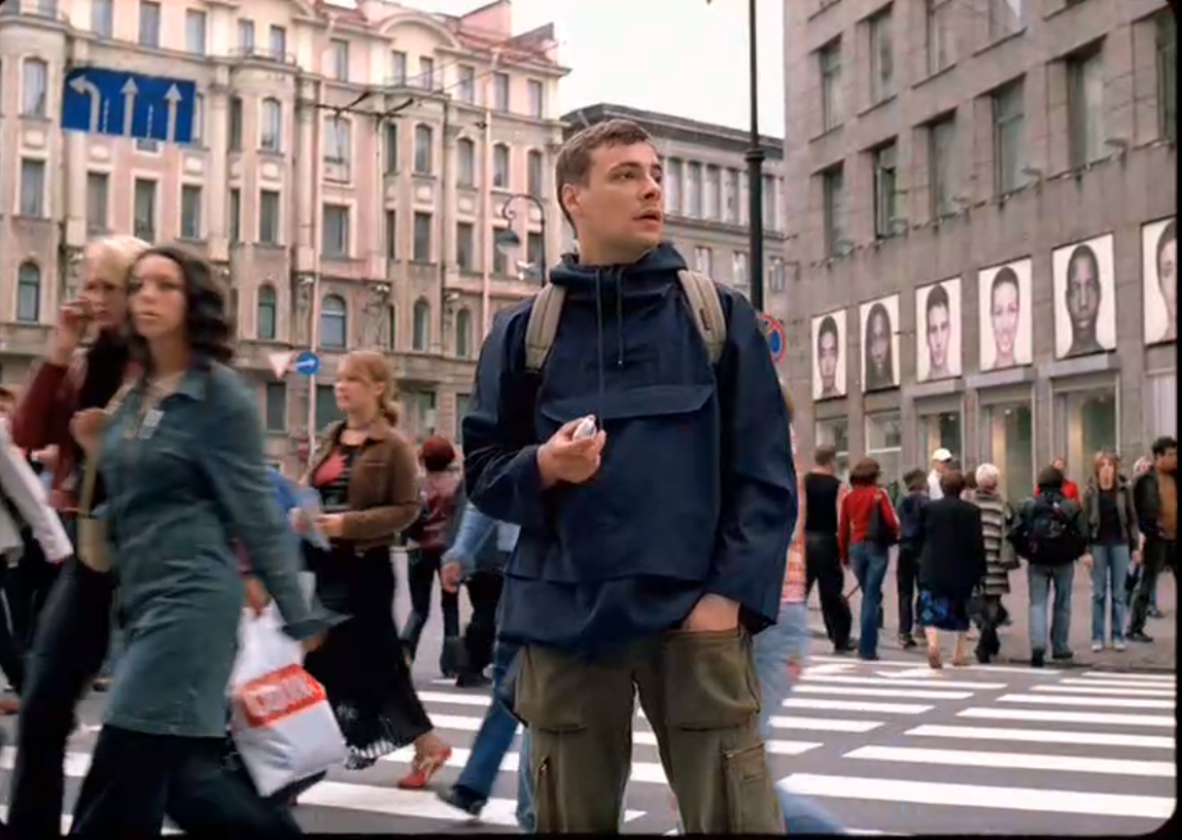 Крупный план Маши, крупный план Максима — камера и время будто замедляются, пока они ждут зеленого светофора. Она идет от Театра антрепризы, он — со стороны метро «Петроградская». В толпе Маша теряет телефон-раскладушку, который прикреплен на шнурок на шее (да, в 2006-м их так и носили). Максим мобильный подбирает, но не успевает понять, кто его выронил.