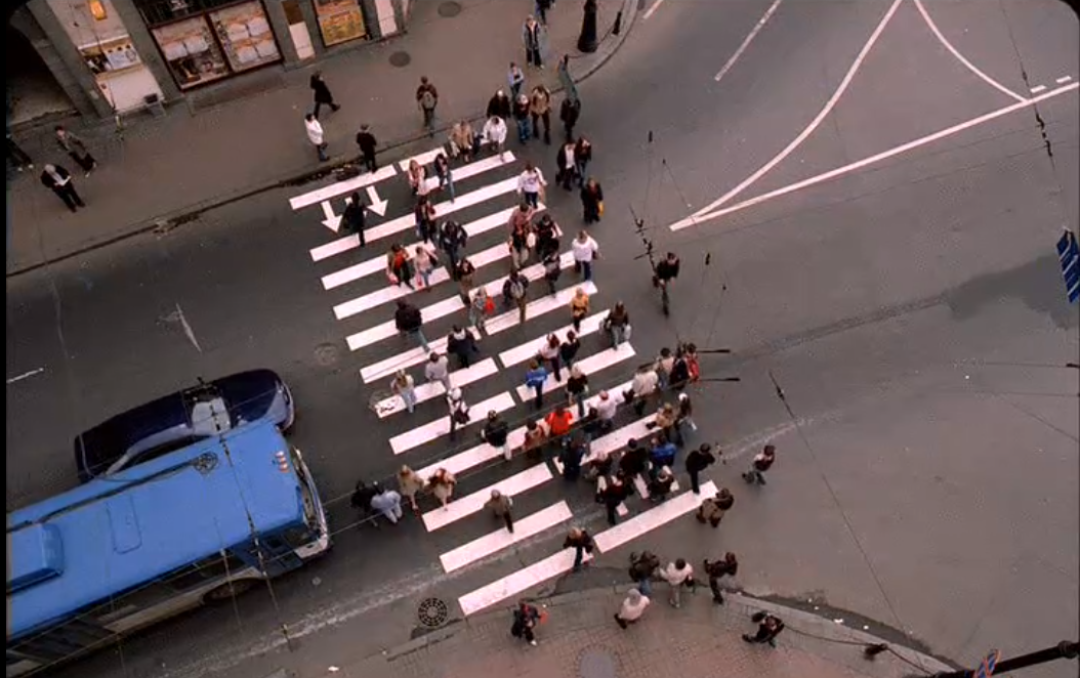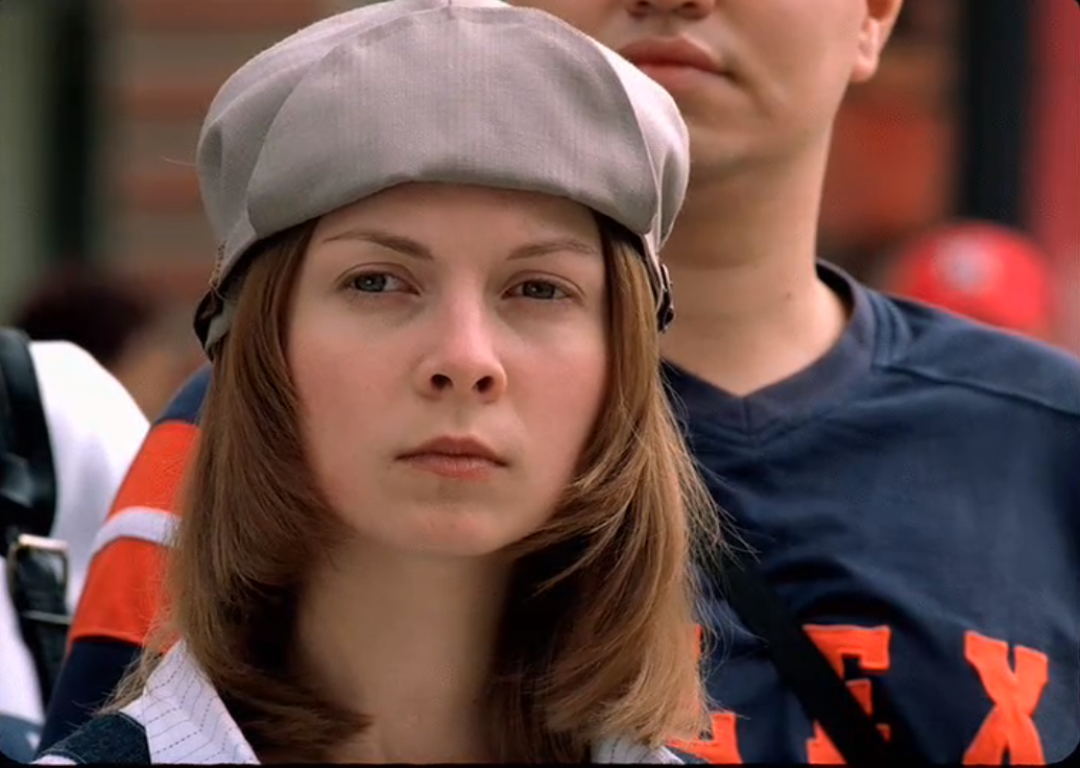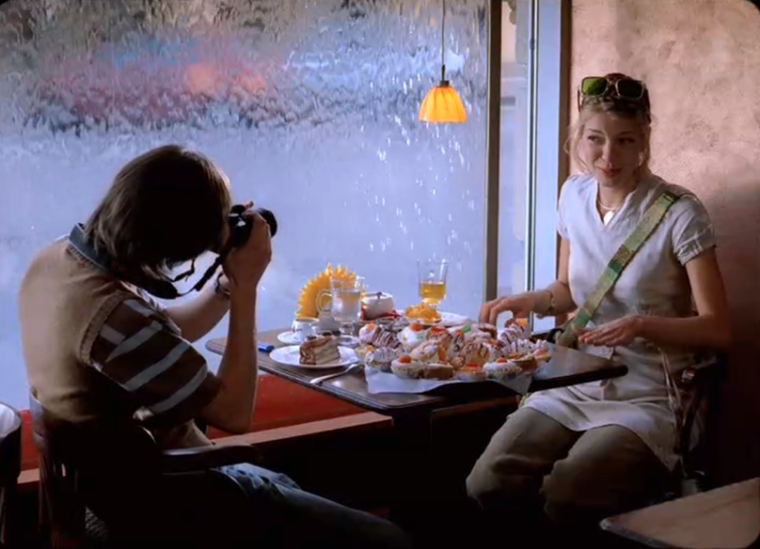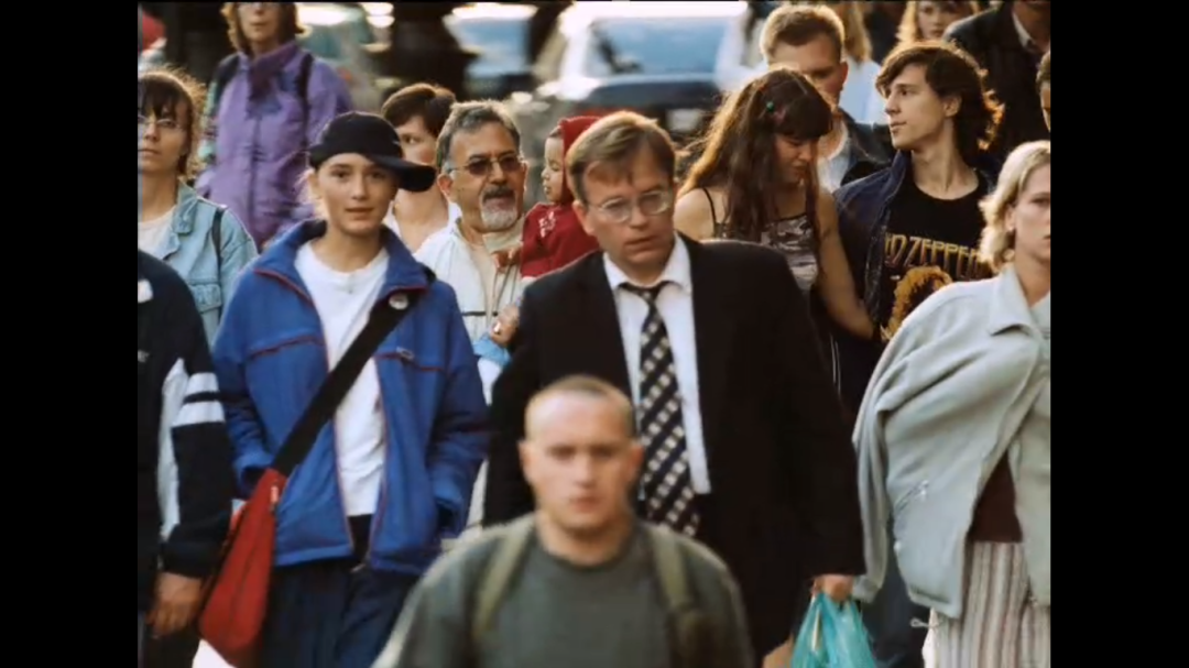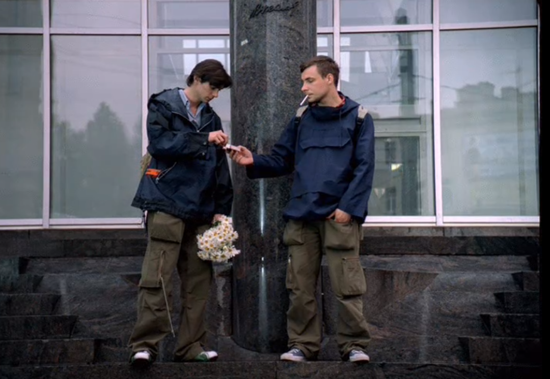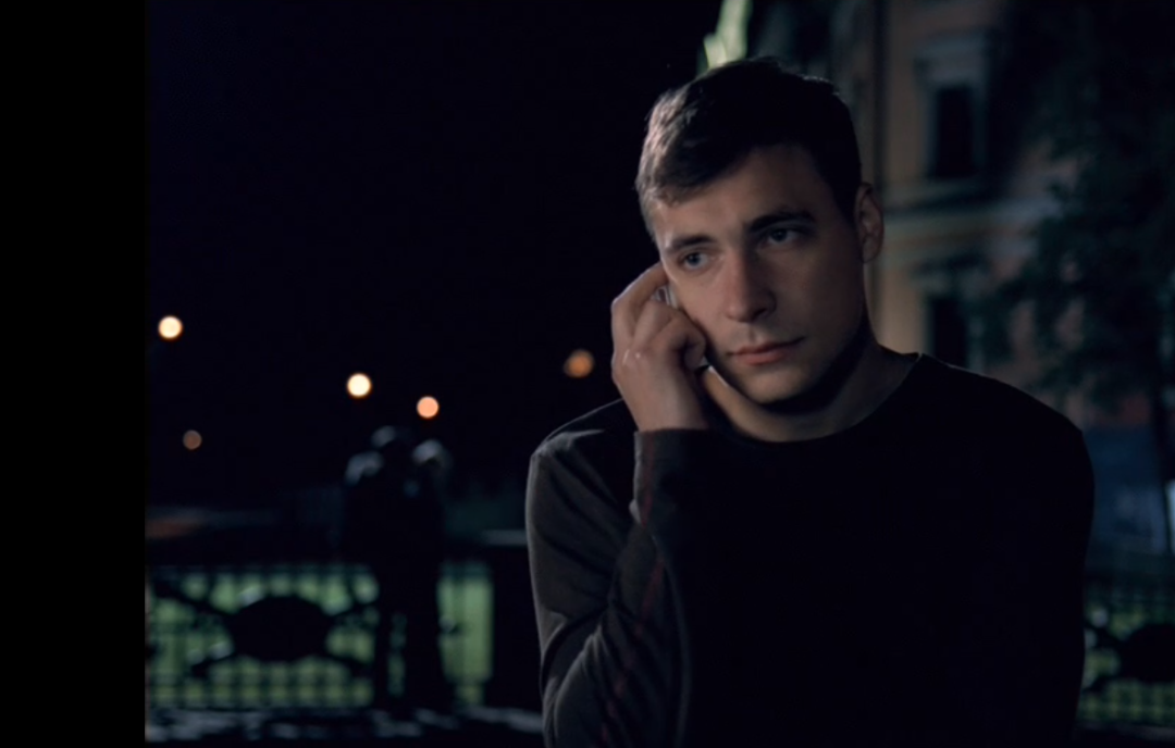 Крупный план Маши, крупный план Максима — камера и время будто замедляются, пока они ждут зеленого светофора. Она идет от Театра антрепризы, он — со стороны метро «Петроградская». В толпе Маша теряет телефон-раскладушку, который прикреплен на шнурок на шее (да, в 2006-м их так и носили). Максим мобильный подбирает, но не успевает понять, кто его выронил.