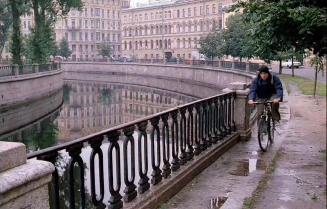 Максим проезжает на велосипеде несколько узнаваемых локаций. Но, пожалуй, этот извилистый поворот канала Грибоедова наиболее примечателен. Его и отметим.