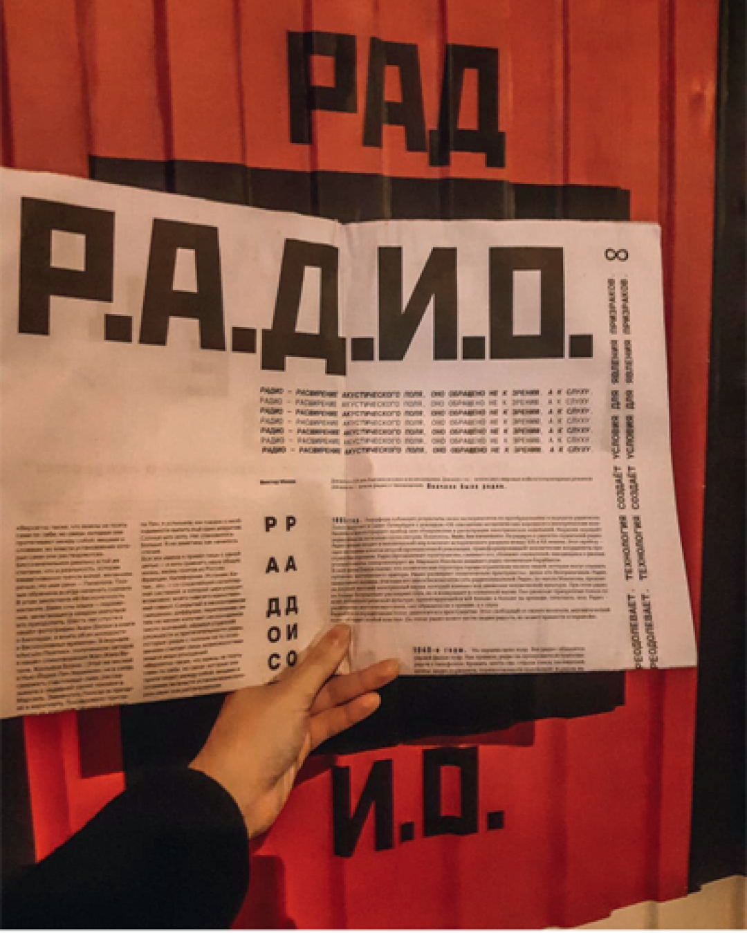 Номер концептуальной газеты «Р. А.Д. И.О» со статьями Виктора Мазина, стихами Аркадия Драгомощенко, рецензией Даниила Хармса и дизайном Андрея Шелютто, напечатанный к открытию новой институции, гости уносили как сувенир с открытия. Похоже, он стал коллекционным.