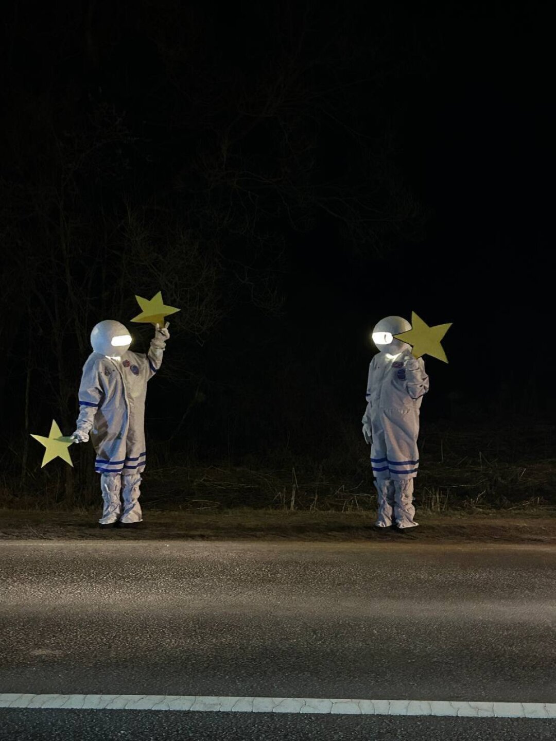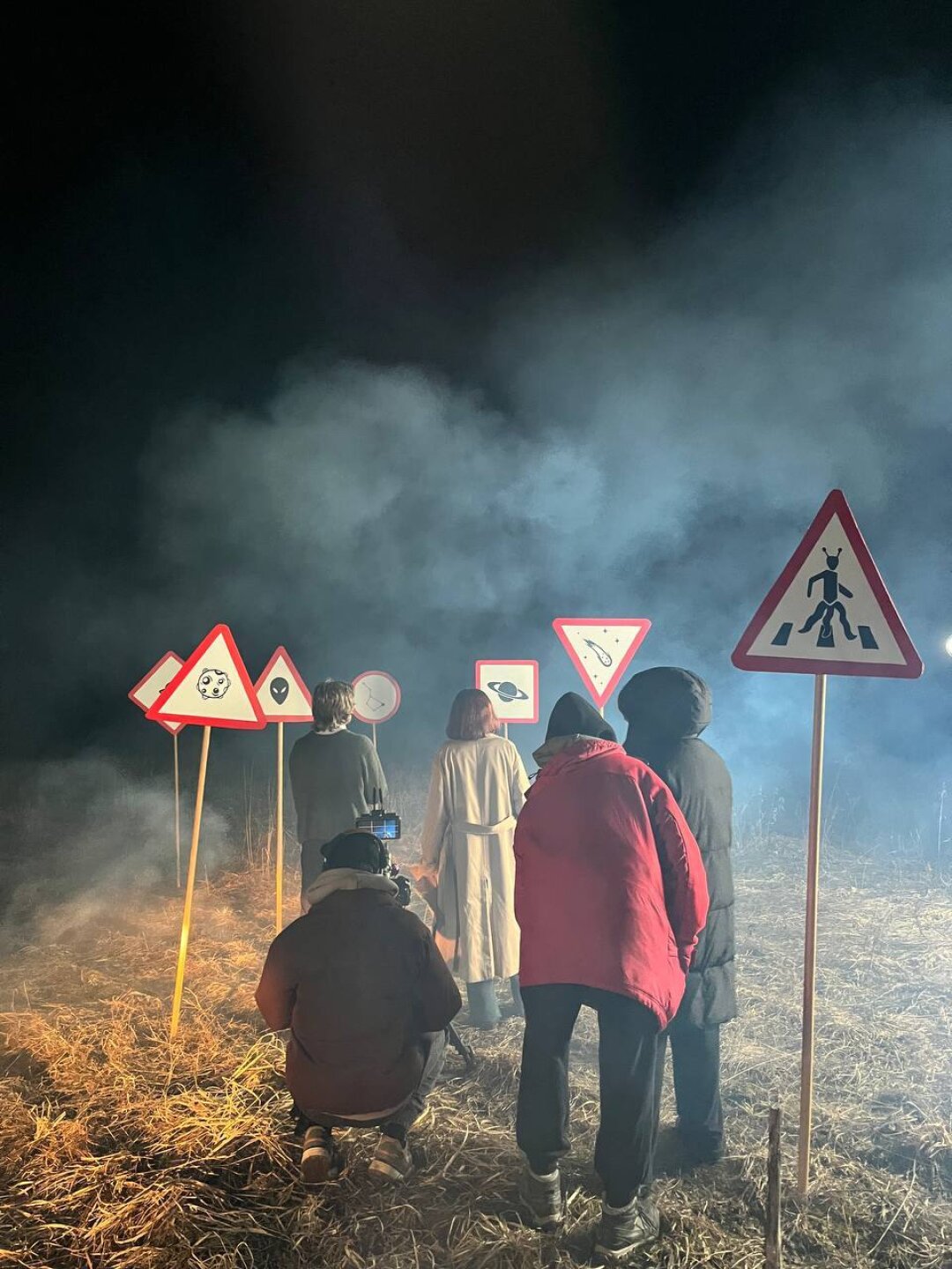 Любимые кадры в клипе — встреча с космонавтами на автобусной остановке и поиск звезды перед знаками. Во-первых, они композиционно красивые, а во-вторых, мы снимали их особенно долго, поэтому они запомнились лучше всего. Космонавтов на автобусной остановке снимали люди на проезжающих мимо машинах, кстати, так что не мне одной этот кадр понравился, похоже.