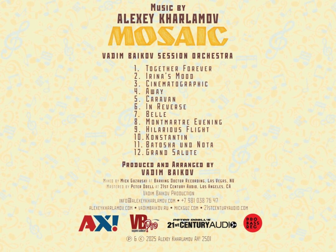 А. Х.: Сколько себя помню, всегда сочинял мелодии, песни. На определенном этапе возникла идея как-то зафиксировать творческие идеи и наработки. Поэтому некоторое время назад я приступил к работе с разными музыкантами. Стал записывать собственные произведения, поначалу в песенном жанре. Но потом мне пришла в голову идея попробовать записать инструментальную музыку, такие сочинения у меня тоже были. Когда я предложил эту идею своему другу, звукорежиссеру Всеволоду Устинову, он любезно согласился познакомить меня с аранжировщиком, занимающимся различными жанрами инструментальной музыки. Так я познакомился с великим музыкантом и обаятельным человеком Вадимом Байковым. Чудесным образом Вадим не только откликнулся, но между нами возникло по-настоящему интересное, бурно развивающееся творческое соработничество. Когда мы с Вадимом стали заниматься «Мозаикой», он фактически вдохнул в этот проект настоящую жизнь, но для Вадима временами это было настоящим испытанием. Некоторые композиции, изначально представляли собой даже не наброски. Скорее их можно было бы назвать наскальной живописью первобытного человека.