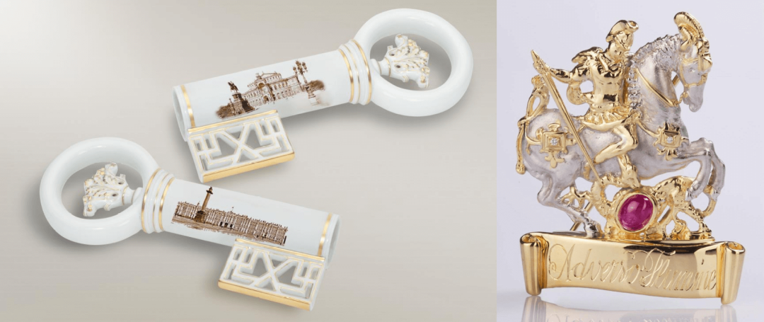 Ключи изготовлены вручную и расписаны на Мейсенской мануфактуре. Темы росписи, выполненной мастерами во всех отношениях первой фарфоровой фабрики Европы, — городские мотивы Дрездена и Санкт-Петербурга. Также на церемонии одному из специальных гостей будет вручена награда «Дрезденского ЗемперОпера Бала» — Саксонский орден Святого Георгия. Гравировка на нем гласит: Adverso Flumine, то есть, в переводе с латинского, «против течения», она вручается действительно выдающимся людям. Ранее ее удостаивались актер Ален Делон, принц Монако Альбер II, бывший премьер-министр Люксембурга Жан-Клод Юнкер, главный тренер сборной России по футболу Станислав Черчесов, который довел команду до четвертьфинала в ЧМ прошлого года.