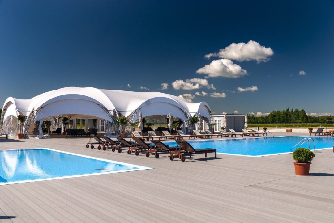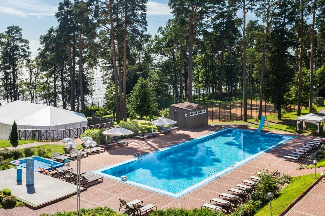 Это закрытый спа-отель в 40 минутах от Петербурга — в Зеленогорске. На территории есть открытый бассейн. В нем можно поплавать, не проживая в отеле, с 11:00 до 19:00. Стоимость дневного посещения для взрослых (с 12 лет) составляет 5000 рублей и включает в себя шезлонг и полотенце. Детям отдых обойдется в 2500 рублей, до 3 лет — бесплатно. В аренду предоставляют приватный шатер с двумя лежаками за 12 000 рублей с 10:00 до 20:00.