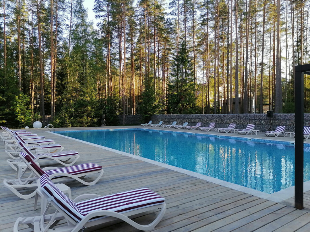 На территории загородного отеля в Выборгском районе работает открытый подогреваемый 24-метровый бассейн. Температура воды в нем всегда составляет 30 градусов. Рядом расположена сауна, зона для отдыха, комнаты для переодевания и автоматический минимаркет. Попасть сюда могут не только проживающие, но и посетители отеля. Стоимость посещения для взрослого составляет 1000 рублей за три часа, для детей с 3 до 10 лет — 500 рублей, до 3 лет — бесплатно. Есть месячный абонемент — его можно приобрести за 6000 рублей.