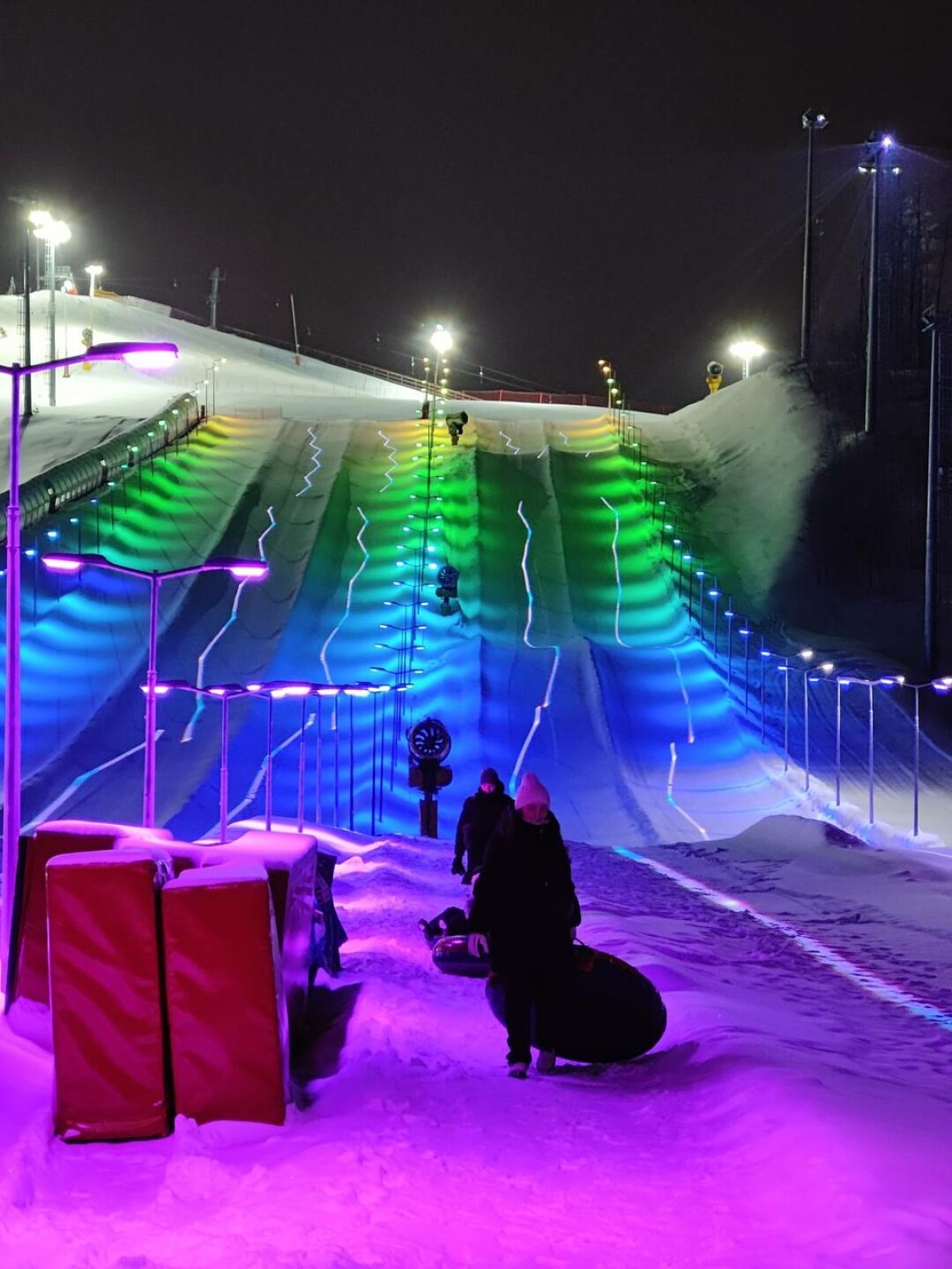 На территории модного всесезонного курорта традиционно зимой открывают склон для тюбинга: пять желобов для спуска протяженностью 230 метров, украшенных разноцветной подсветкой. План максимум: выучить скольжение по дуге на самом нескучном катке Петербурга, встать на лыжи и посетить спа.