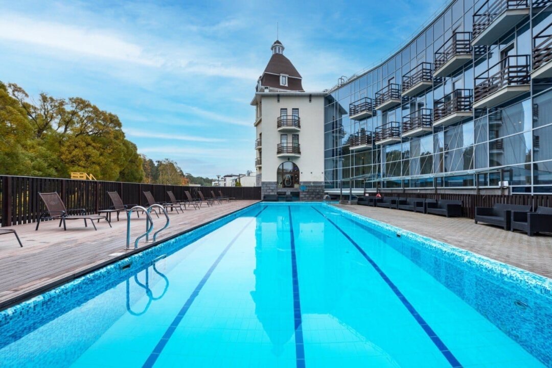 Единственный в Петербурге открытый всесезонный бассейн с морской водой: его длина — 23 метра, а температура воды всегда — +27…+29 градусов. Не проживая в отеле, можно посетить спа-комплекс по предварительной записи в промежутки с 11:30 до 14:00, с 14:00 до 16:30, с 17:00 до 19:30, с 20:00 до 22:30. В стоимость входит хамам и финская парная, за дополнительную плату — фитопаросауна из кедра.