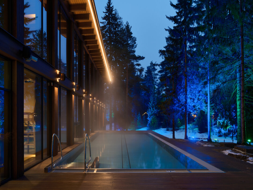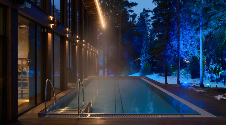 На модном всесезонным курорте зимой мы учим двойной тулуп на коньках, медвежий разворот на лыжах и круглый год плаваем в бассейнах. В спа-центре Ohtakai есть 15-метровый уличный и два выплывных — один с панорамным видом на хвойный лес, другой наполнен минеральной водой. Для отдыха с семьей больше подойдет комплекс бассейнов: два взрослых и два детских в окружении соснового леса.