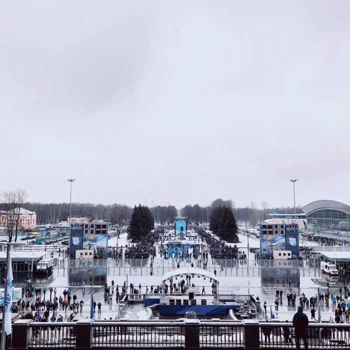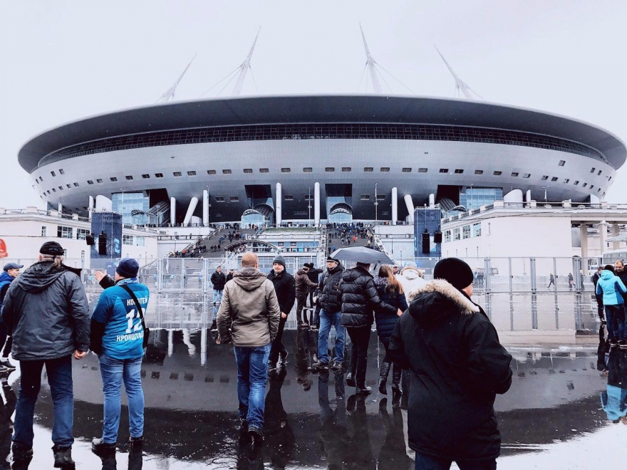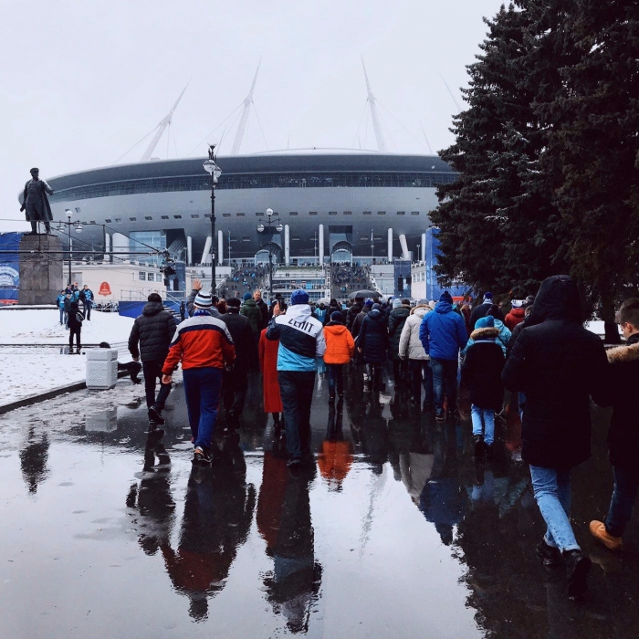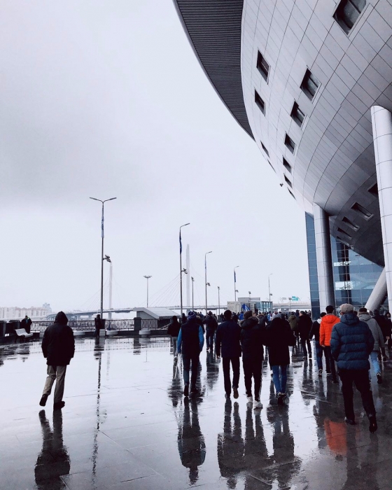 Утро в Петербурге выдалось явно не весенним: мокрый снег вперемешку с дождем. Как итог - огромные лужи, из-за которых ноги намокали за считанные минуты. Идя по аллее от метро Крестовский остров с огромной толпой фанатов, я рассчитывал увидеть снегоуборочную технику, но ее не было. Почти. Ну, точнее, одна единица одиноко проехала в сторону выхода с парка. Чем ближе к стадиону, тем больше луж. На подходе они были абсолютно везде: люди с трудом обходили их, кто-то, наоборот, наплевав на все, шел прямо по ним. Разумеется, никакой уборочной техники не было.