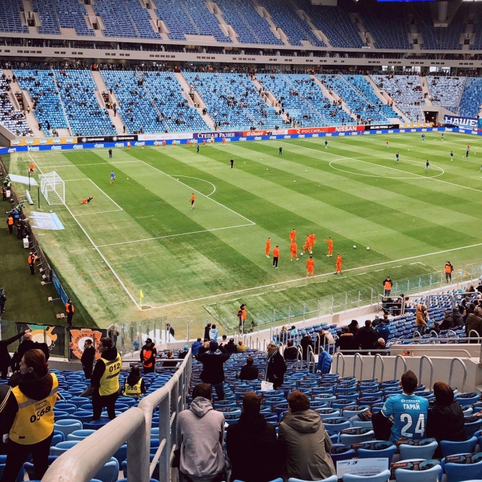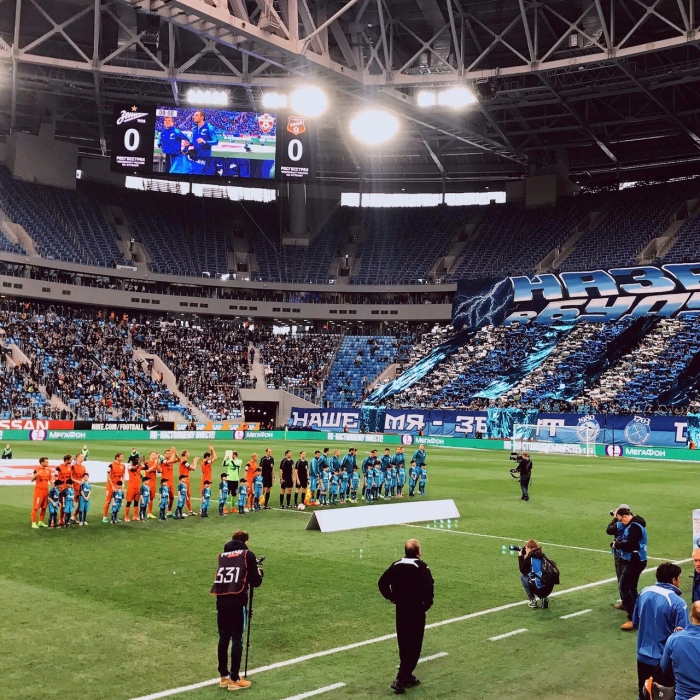Не могу не сказать про акустику. Ее просто нет. Я не шучу. Когда диктор что-то говорит в микрофон, его слова просто не доносятся до трибун, утихая где-то под сводами стадиона. Но бог с ним с диктором: когда фанатский сектор заряжал из раза в раз, его было тупо не слышно. Как так получилось? Не знаю. Весь звук почему-то уходит куда-то вверх. В итоге, вместо привычных кричалок, которые можно было слышать на Петровском, до меня долетали отдельные "Бу-бу-бу Питер", "Бу-бу-бу эй-эй!"