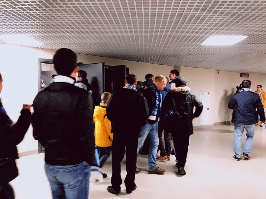 Внутри стадиона, на первый взгляд, все неплохо. Мне, как человеку с плохим зрением, вообще показалось, что все идеально. Но нет. По факту, минусов масса: фанаты не могут пройти по абонементам, потому что не работали компьютеры; зона проверки билетов это письменный стол и парень моего возраста с рацией, который теряется и не может ответить на простые вопросы; зачем-то сделаны двери с ручками, которые надо открывать, входя на стадион (wtf вообще?), при этом, двери заедают и открываются через раз. И это я еще не говорю о том, что происходит, когда вы спускаетесь на трибуну.