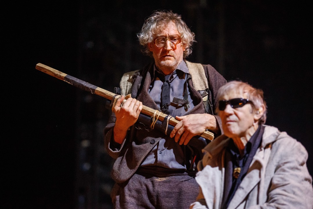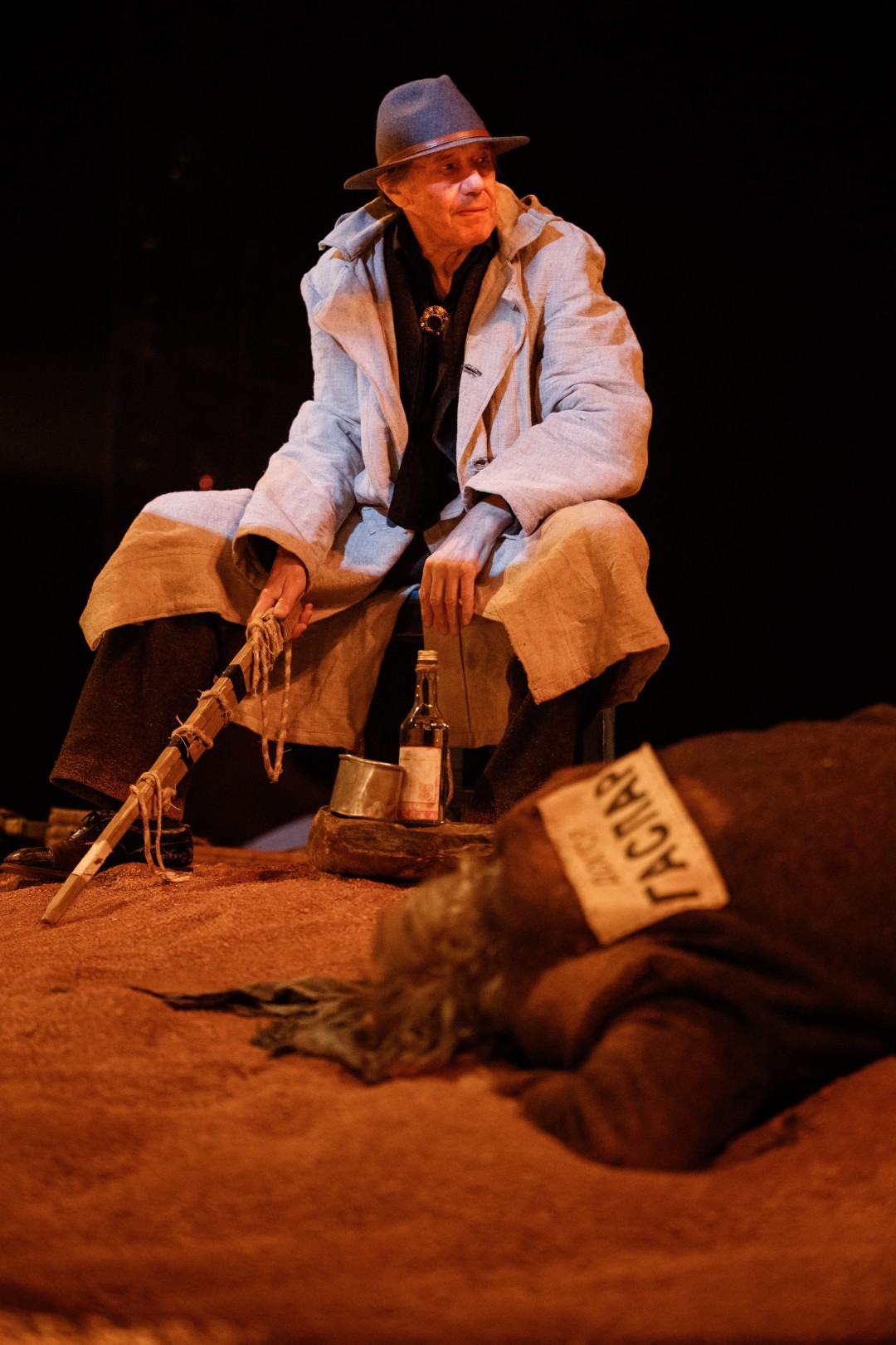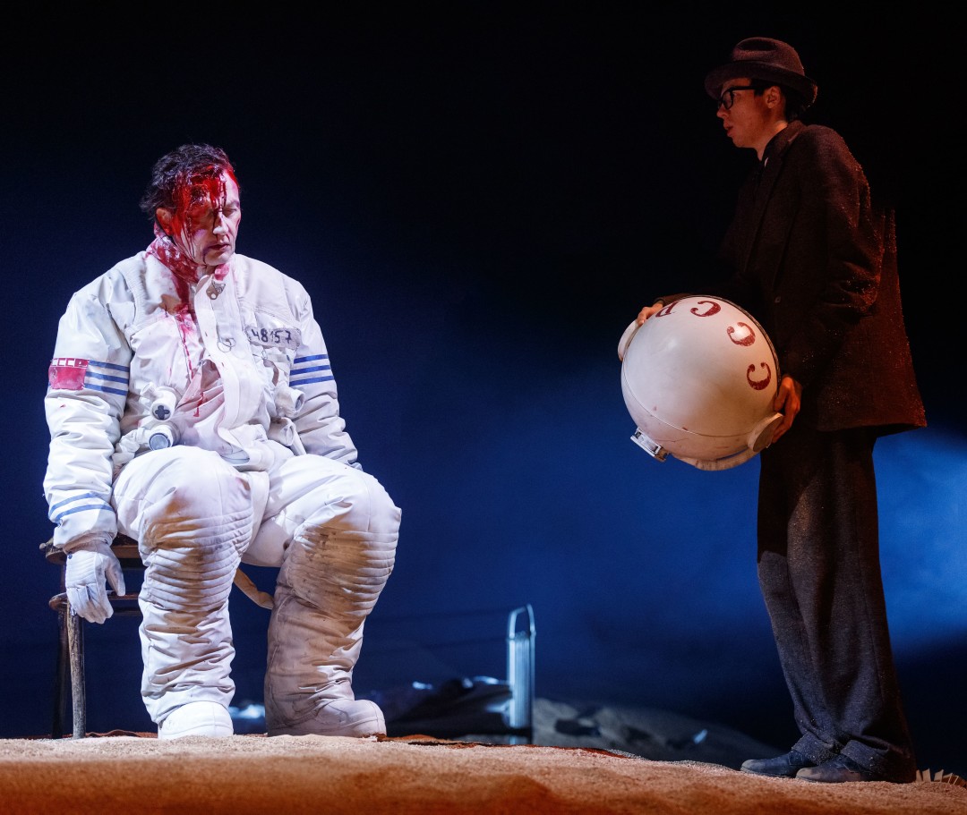 Сергей Дрейден из той нечасто встречающейся породы актеров, которых посади спиной к залу у арьера, и все равно будет интересно смотреть и наблюдать. Что, собственно, и происходит вплоть до третьего акта, который в итоге погребает под собой, как уже известный зрителю песок, хрупкую систему, так старательно выстраиваемую первые два с половиной часа действия. Здесь в рифмованной и как бы ироничной форме (привет «Славе» Гусева и Богомолова) рассказывается история мальчика Вани Тубова (эту роль в очередь играют юные Валентин Мендельсон и Лаймон Ронис). Его папу-авиаконструктора (Василий Реутов), мечтавшего о космосе, арестовывают, затем бесследно исчезает и мама (Нина Александрова), а Ваня вместе со старшей сестрой Таней (Ольга Ванькова) фактически остаются сиротами. У них, правда, еще имеется гротескный каламбурящий дедушка (похожий на доброго домового Дмитрий Воробьев), выходы которого столь эпизодичны и непродолжительны, что по факту его и нет. Со сцены тем временем льется каскад банальностей и очевидностей, упакованных в форму, напоминающую о позднесоветском театре 1980-х. Сперва материализуется гигантский таракан (Анатолий Петров в рыжем парике), когда-то неосторожно спасенный сердобольным мальчиком, который — вуаля! — волею режиссера и усилиями гримеров превращается, конечно же, в товарища Сталина. Безликие люди в синих энкавэдэшных шинелях метафорически мучают папу, облаченного в скафандр и подвешенного на лонже, раскачивая его туда-сюда. Гигантский — во всю сценическую высь — сталинский портрет «пожирает» оставшихся ваниных родственников и просто безвестных людей (привет «Метрополису» Ланга). Тане устраивают в школе показательное судилище, требуя отречься от отца. И так далее. Все происходит то ли наяву, то ли в воображении ребенка – реальность смешивается с детской фантазией так, что уже и не разделишь. Завершает удивительный визуальный ряд серия портретов детей, чьих родителей определили врагами советского народа. Экраном для проекции служит упомянутое изображение Великого кормчего – детские лица на мгновение совмещаются с лицом того, кто на протяжении почти тридцати лет успешно взращивал в жителях своей страны страх и покорность.