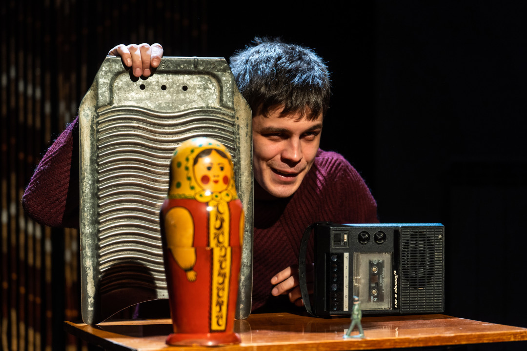 Этот же прием режиссер использует и в инсценировке романа Павла Санаева. Максим Морозов (с которым режиссер работает уже, кажется, на постоянной основе) ставит на стол картонную коробку, открывает ее и медленно начинает вынимать оттуда узнаваемые бытовые предметы — матрешку, магнитофон, изящный флакон духов, оловянного солдатика. Каждый обозначает кого-то из героев будущей истории: бабушку, маму, самого Саню, дедушку. «Распаковав» воспоминания и присвоив объектам их партии, герой приступает к рассказу.
