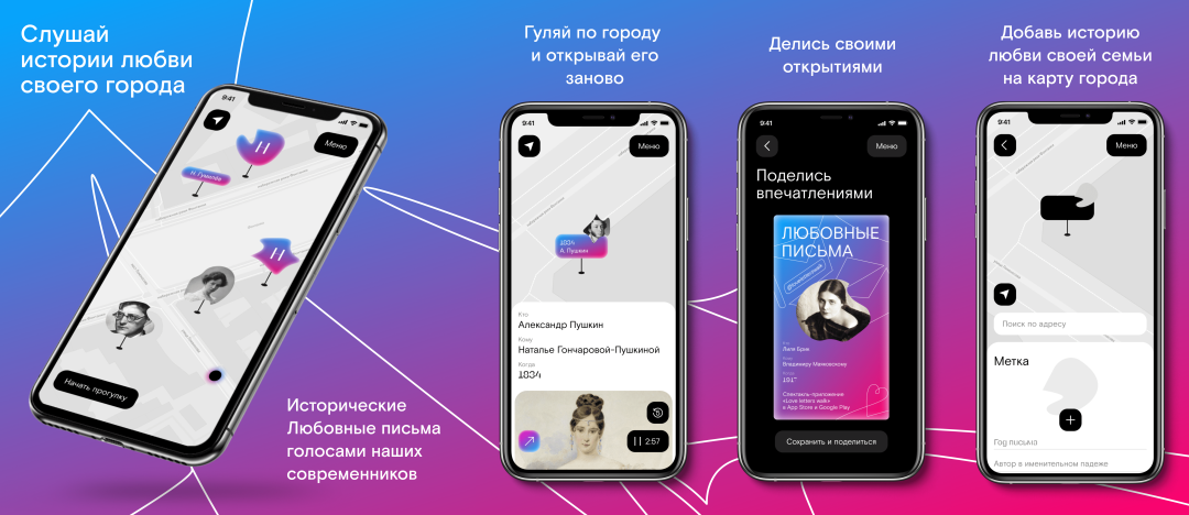Удивительно, что раньше никто не додумался сделать такой аудиперформанс — в основу которого положена любовная корреспонденция знаменитостей ХIХ и ХХ столетий: от Ивана Тургенева с Полиной Виардо до Леонида Андреева с Алисой Коонен. Теперь благодаря продюсеру Анастасии Ким и режиссеру Семену Александровскому на Петербург удастся посмотреть глазами этих выдающихся людей в любое удобное время (спектакль создан на базе бесплатного мобильного приложения), а в наушниках в это время будут звучать голоса Варвары Шмыковой, Дмитрия Лысенкова, Ксении Раппопорт, Федора Федотова, Полины Маликовой (Толстун), Карины Разумовской, хореографа Лилии Бурдинской и даже основателя фонда «Не напрасно» Ильи Фоминцева. После запуска проекта его команда продолжит работу, пополняя уже имеющееся собрание личными историями петербуржцев.